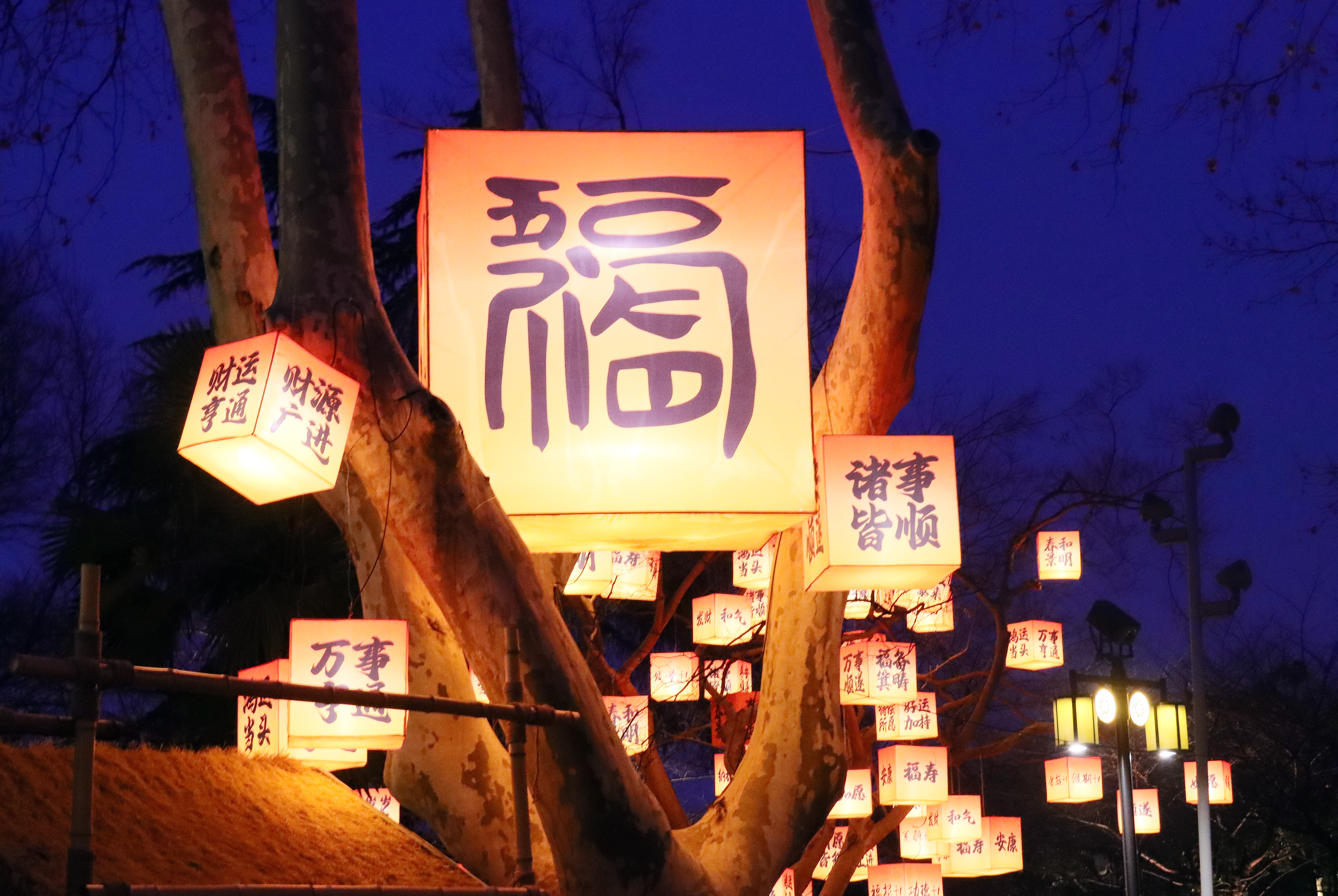 Clusters of cube-shaped lanterns decorated with festive greetings light up the night in Hongmei Park in Changzhou, Jiangsu. /IC