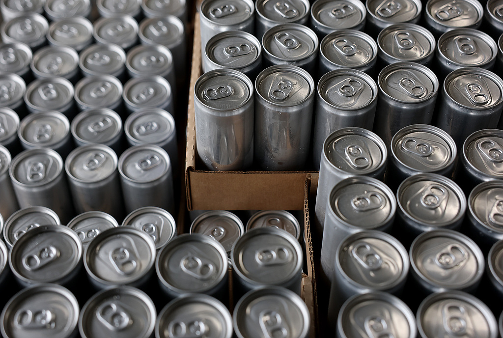 Freshly canned beers move on an assembly line at The Can Van headquarters in Sacramento, California, February 19, 2025. /CFP