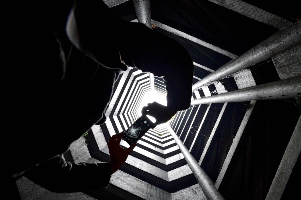 A visitor is seen taking a photo in a tube-shaped apartment block in Chongqing on November 7, 2019. The block was featured in the 2019 Chinese film "Better Days." /VCG