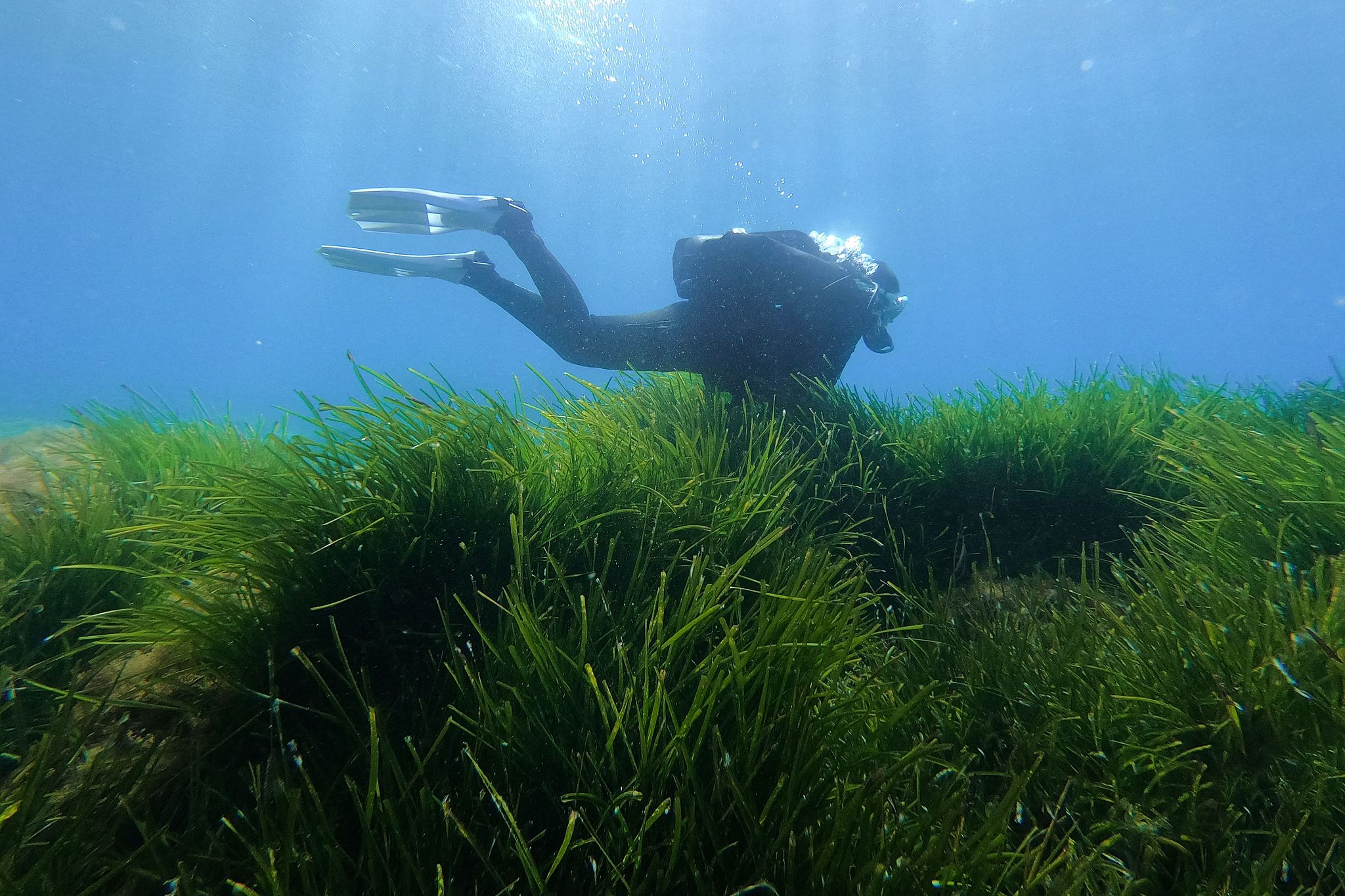 A scuba diver near Posidonia seagrass, often called the "lungs of the Mediterranean," off the coast on Corsica, France, May 6, 2023. /VCG