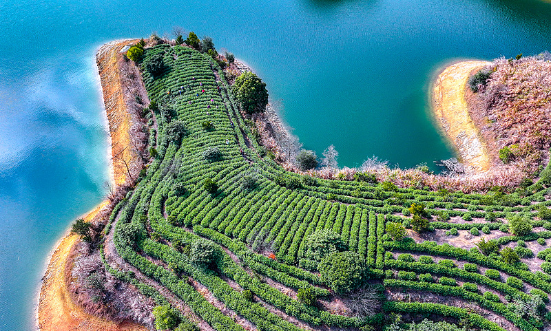 Farmers were busy harvesting tea at a plantation on an island in Qiandao Lake in Chun'an County, Zhejiang Province. As the home of tea in China, Zhejiang has long taken advantage of its rich natural resources to cultivate a wide variety of tea products. Qiandao Lake is one of the most important tea producing areas in the region, covering large areas of forested and cultivated land.