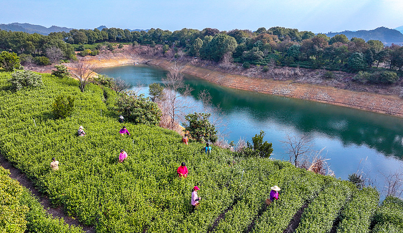Farmers harvest tea at a plantation on an island in Qiandao Lake in Chun'an County, Zhejiang Province, March 1, 2025. /VCG