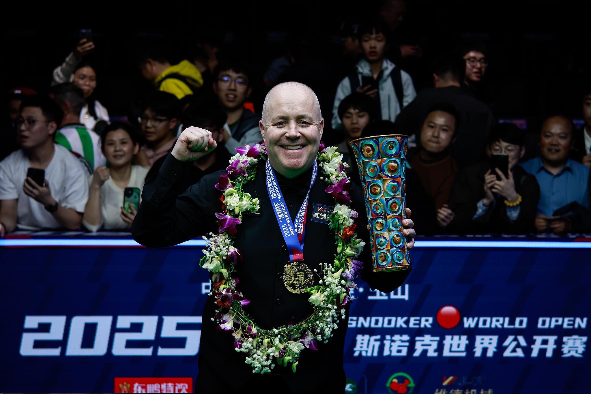 John Higgins of Scotland celebrates winning the World Snooker Tour (WST) World Open title in Shangrao, east China's Jiangxi Province, March 1, 2025. /VCG
