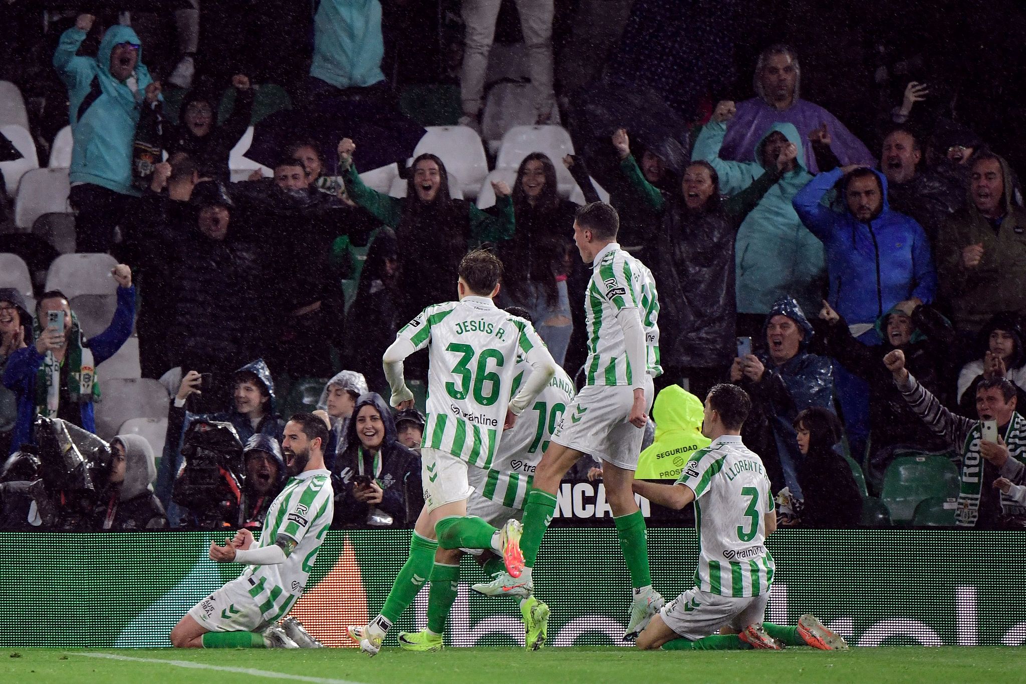 Players of Real Betis celebrate after scoring a goal in the La Liga game against Real Madrid at Benito Villamarin Stadium in Seville, Spain, March 1, 2025. /VCG