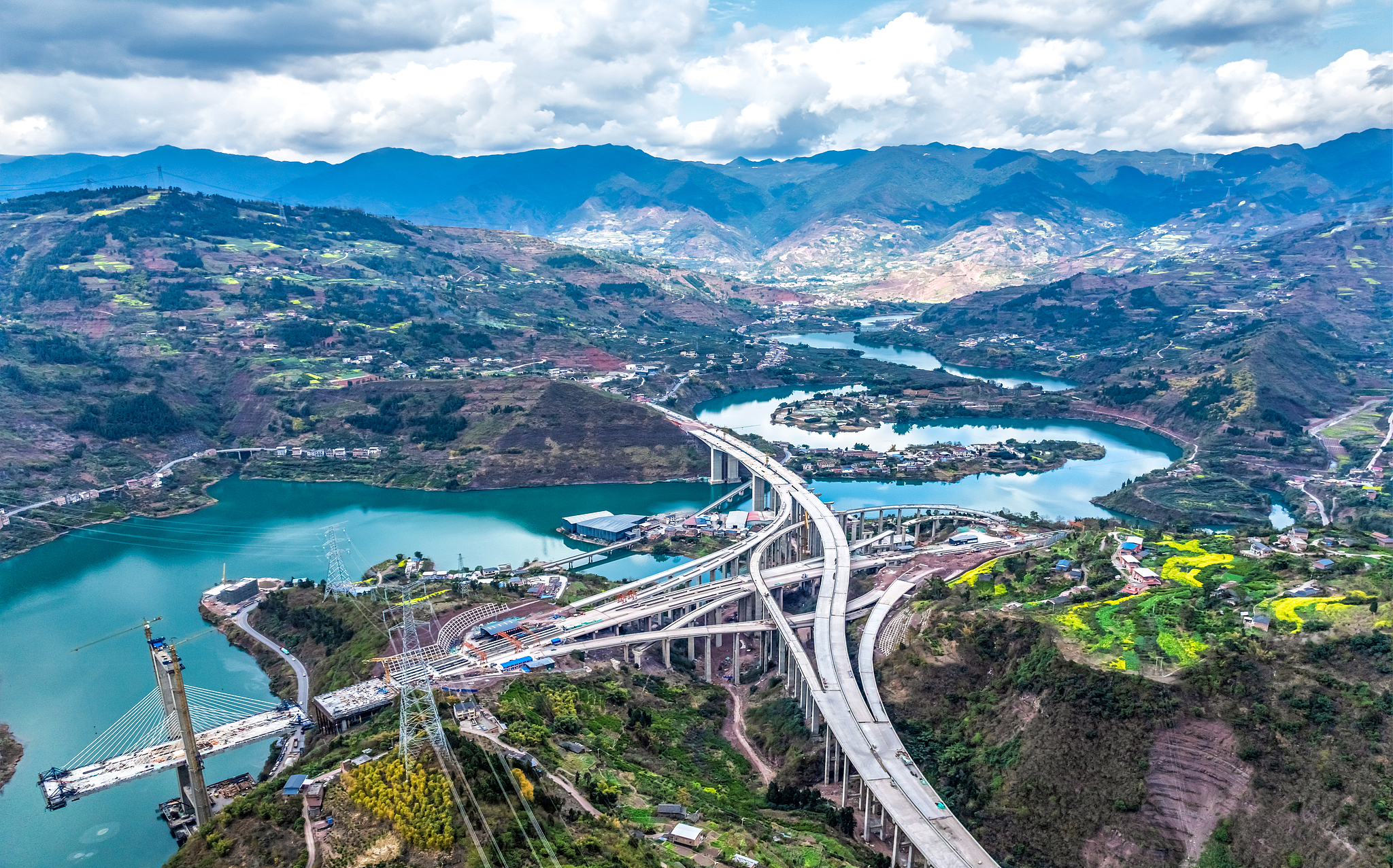 The Yangliuba Interchange Project of the Yanjiang Expressway is under orderly construction at Xinshi Town, Pingshan County, Yibin City, southwest China's Sichuan Province, February 26, 2025. /VCG