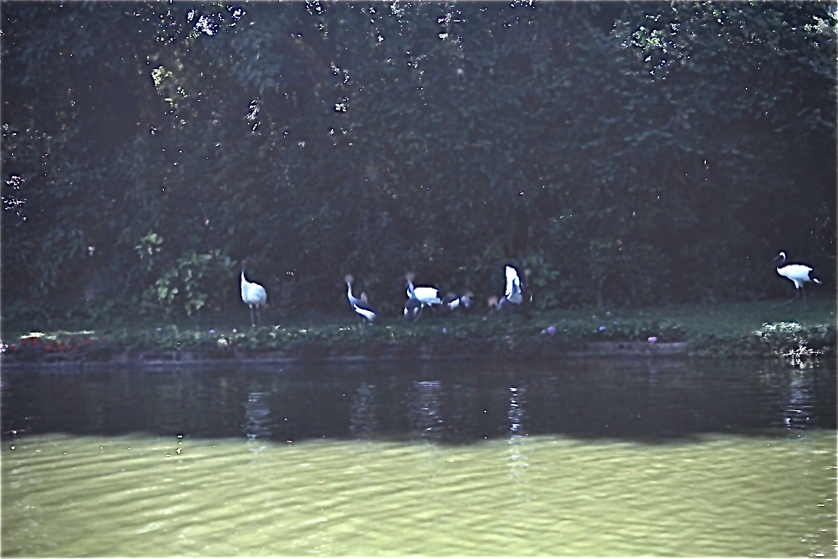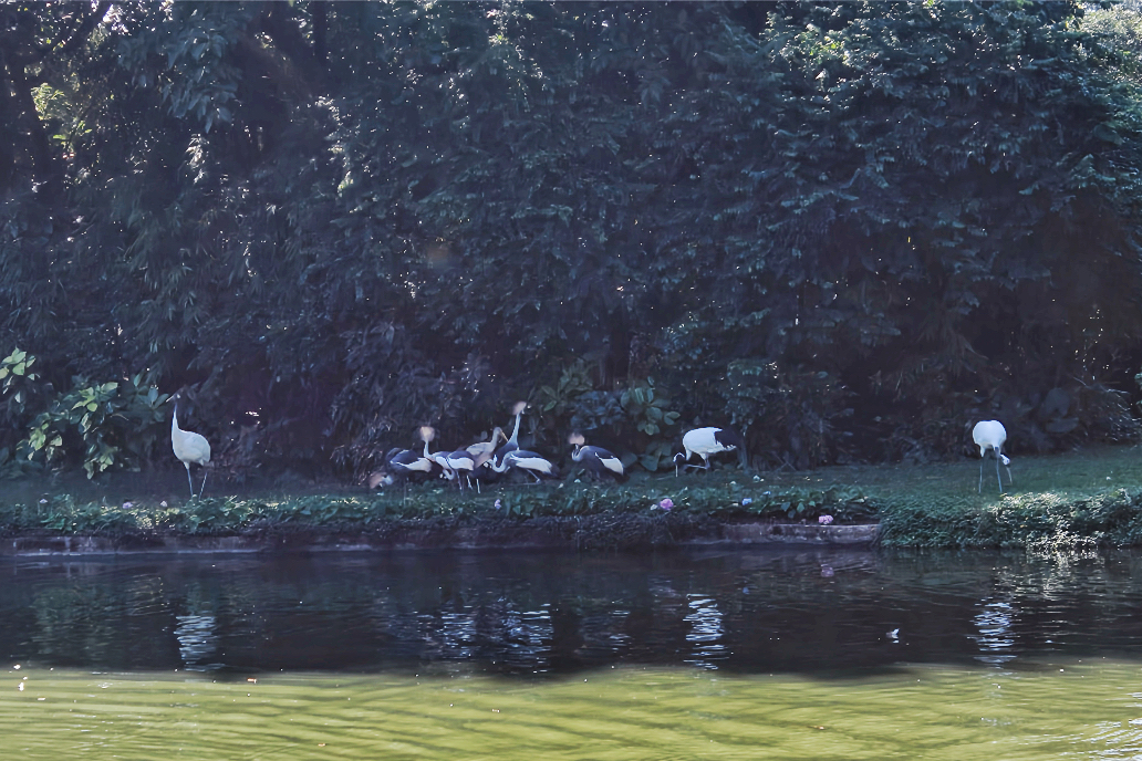A flock of gray-crowned cranes is seen foraging on the banks of a pond at Chimelong Bird Park in Guangzhou, Guangdong, Province. /CGTN