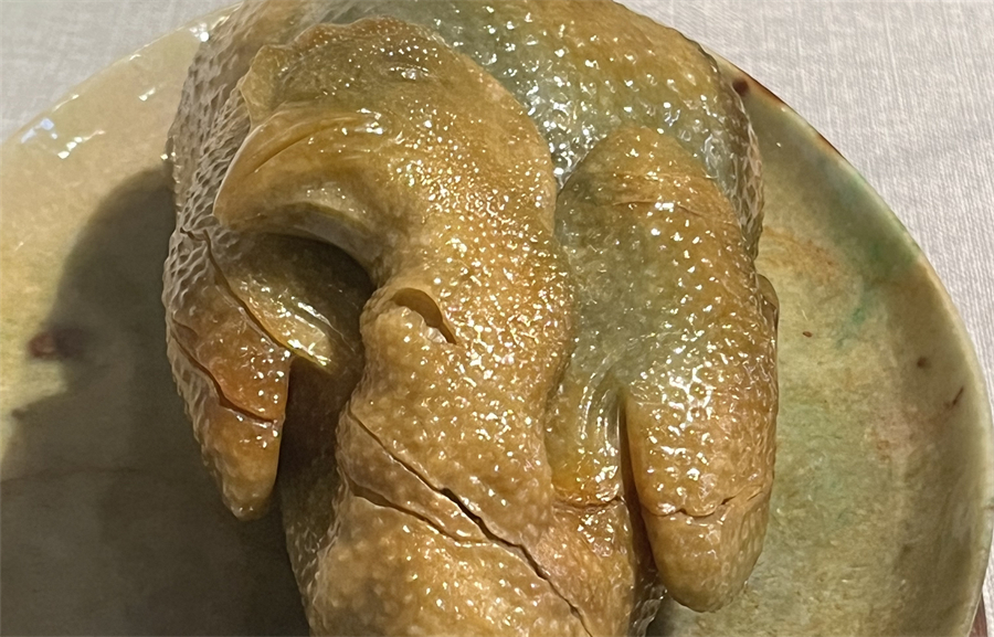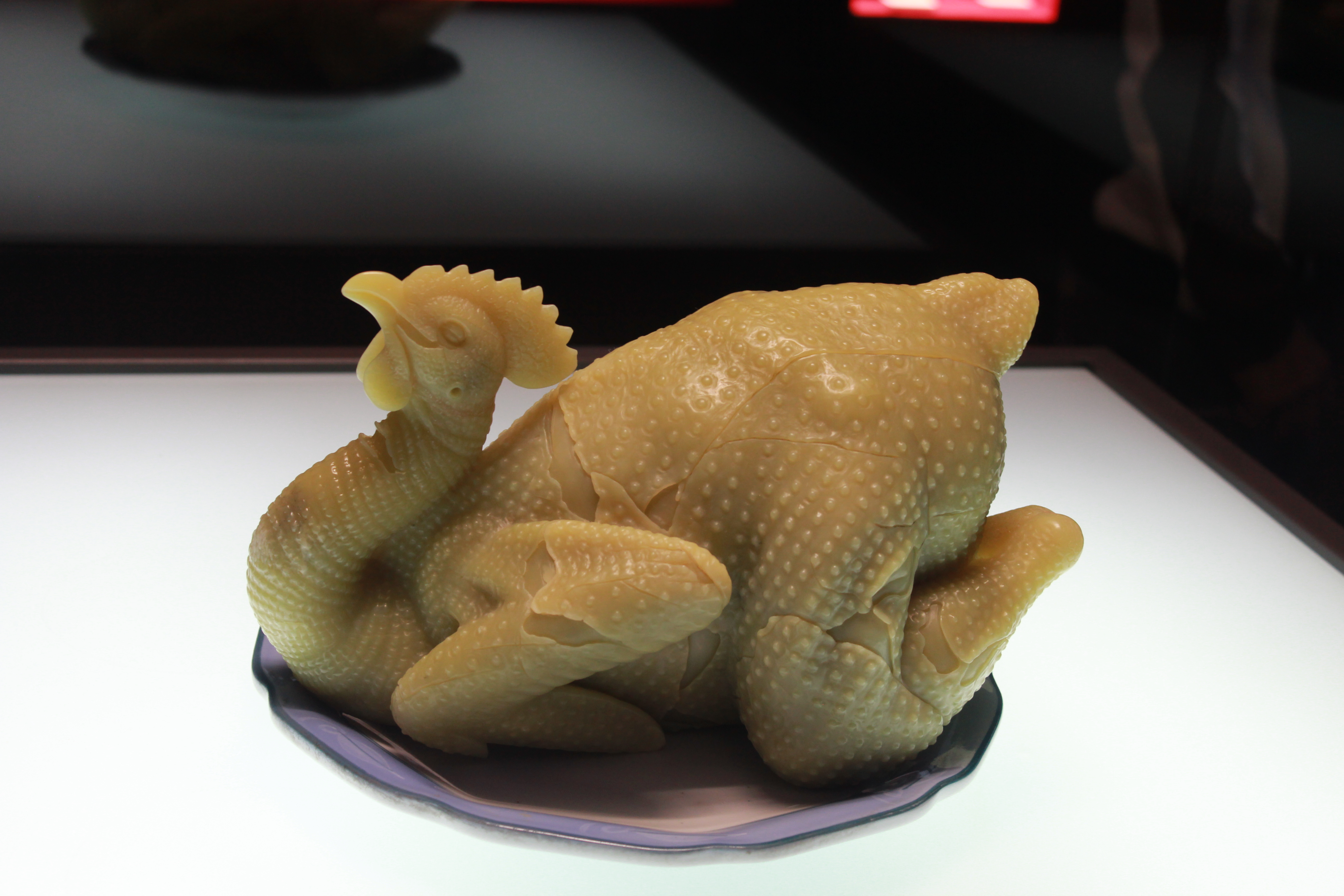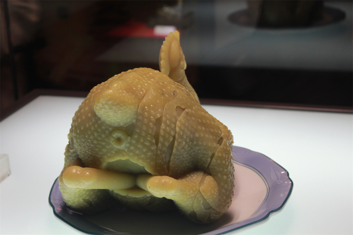 These two Cantonese poached chicken sculptures carved from jade, one on display at the Guangdong Provincial Museum in Guangzhou City, and the other at the Zhaoqing Museum in Zhaoqing City, vividly depict the dehiscent skins and pimples on the skin as if the chickens had just come straight out of the pot.