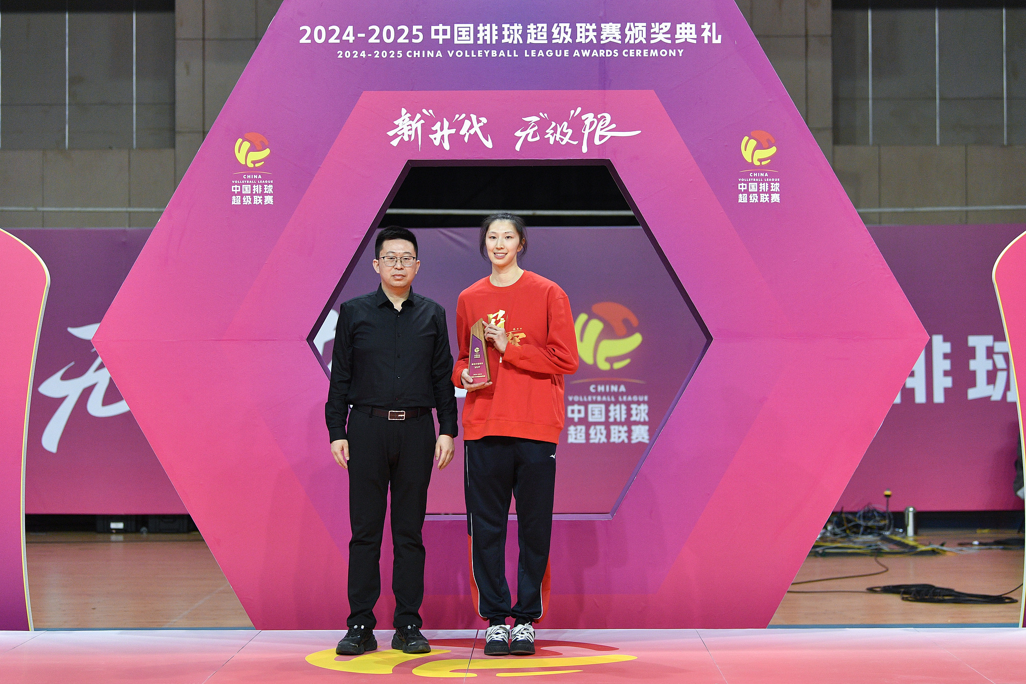 Jiangsu's Wu Mengjie (R) holds the MVP trophy after the China Women's Volleyball League final in Changzhou, Jiangsu, China, March 4, 2025. /VCG