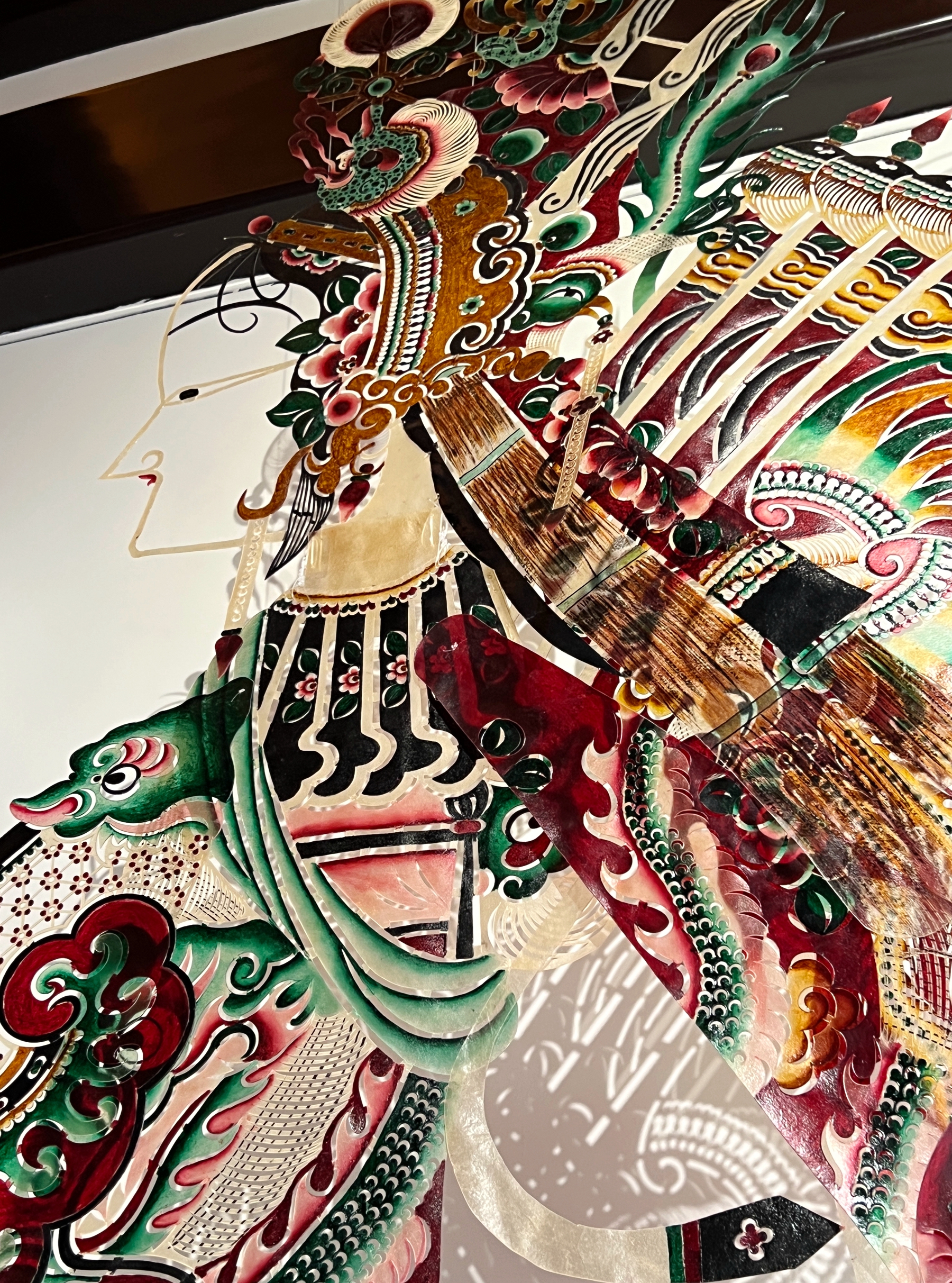 The artwork "Peach Blossom Horse" was created by Wang Haiyan, a fourth-generation inheritor of Wang's shadow puppetry. The 3.8-meter-tall shadow puppet of Mu, created using the technique of hollowed-out paper cuttings, stands in armor holding a long spear with an imposing and heroic presence. With the light shining through the decorative windows, the shadow puppet of Mu Guiying looks even more majestic and magnificent.