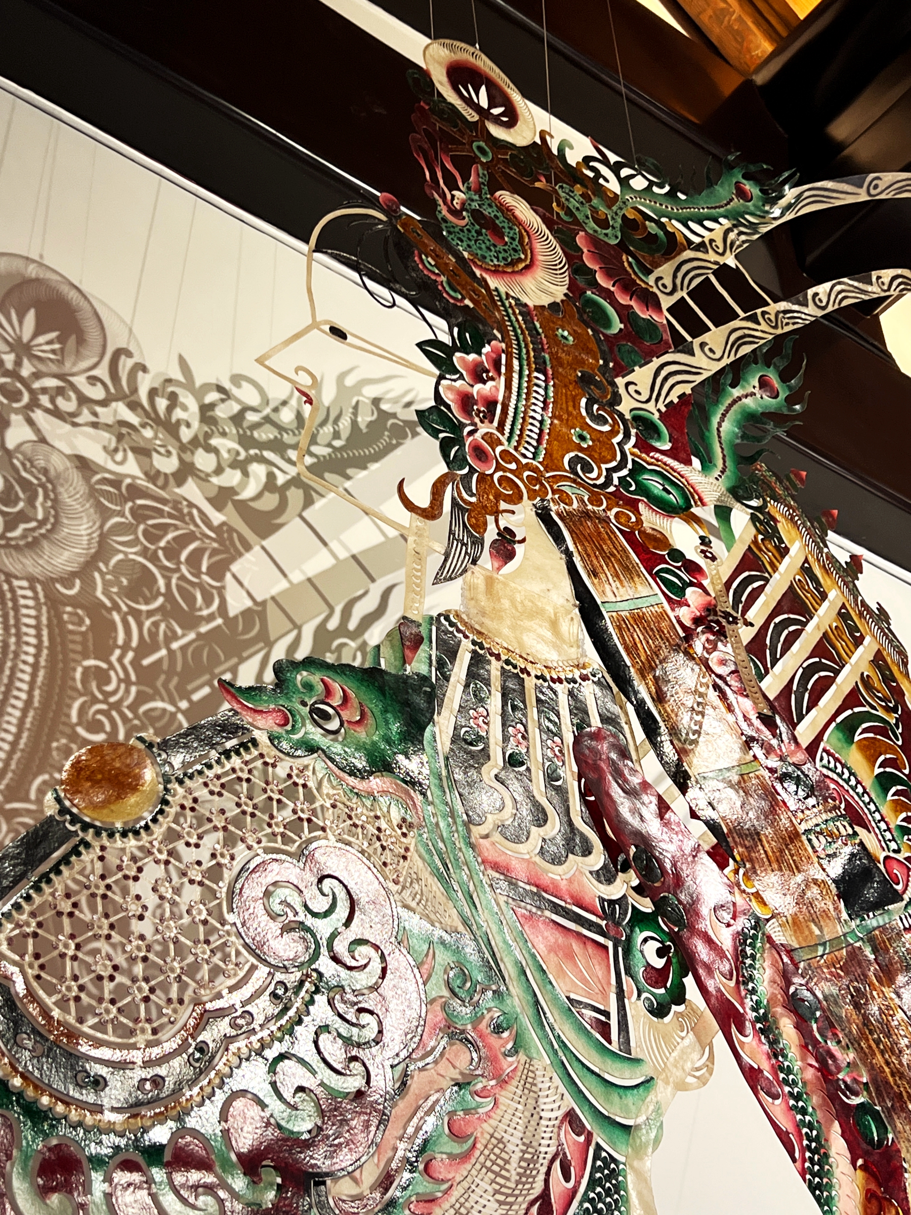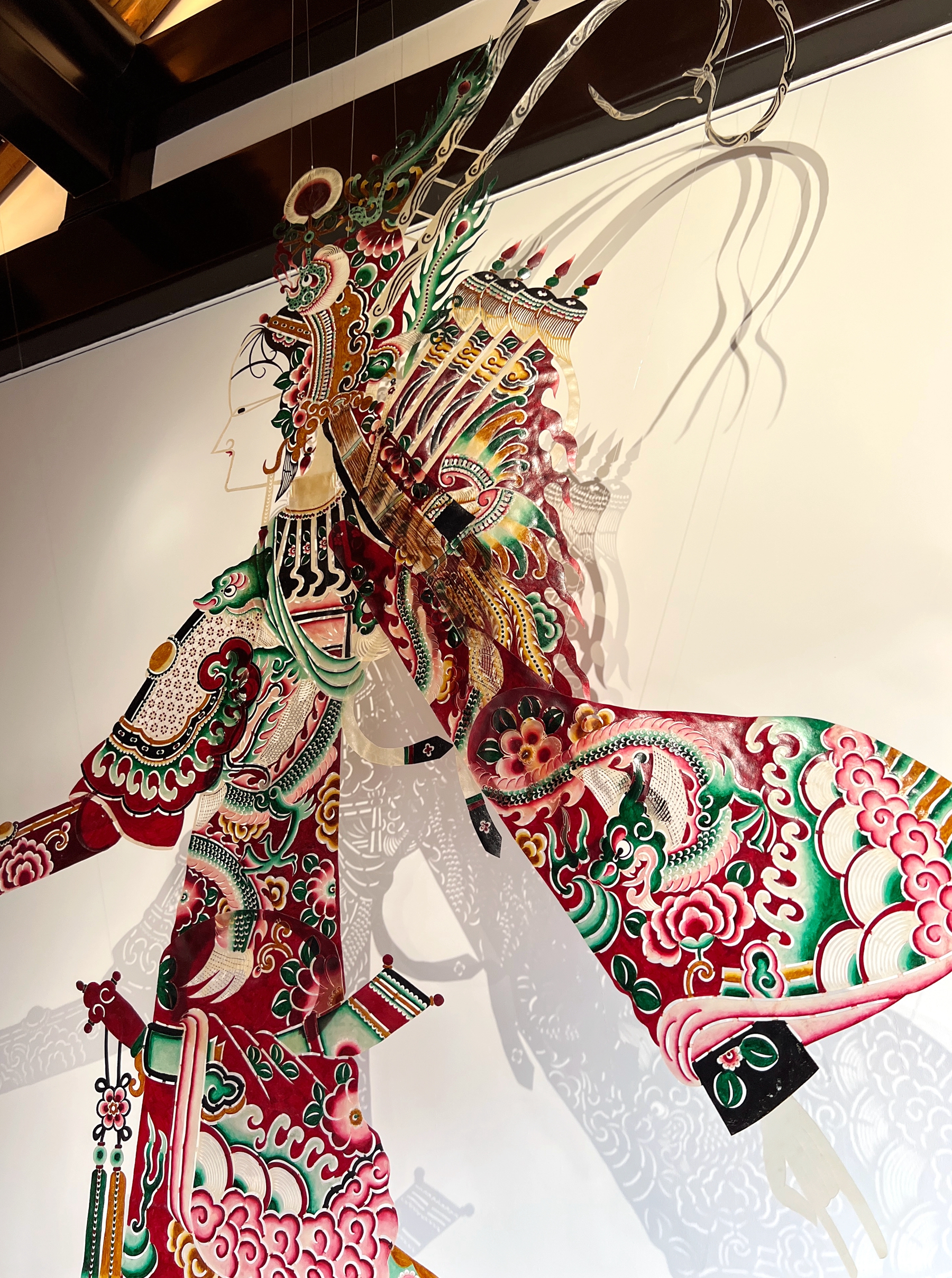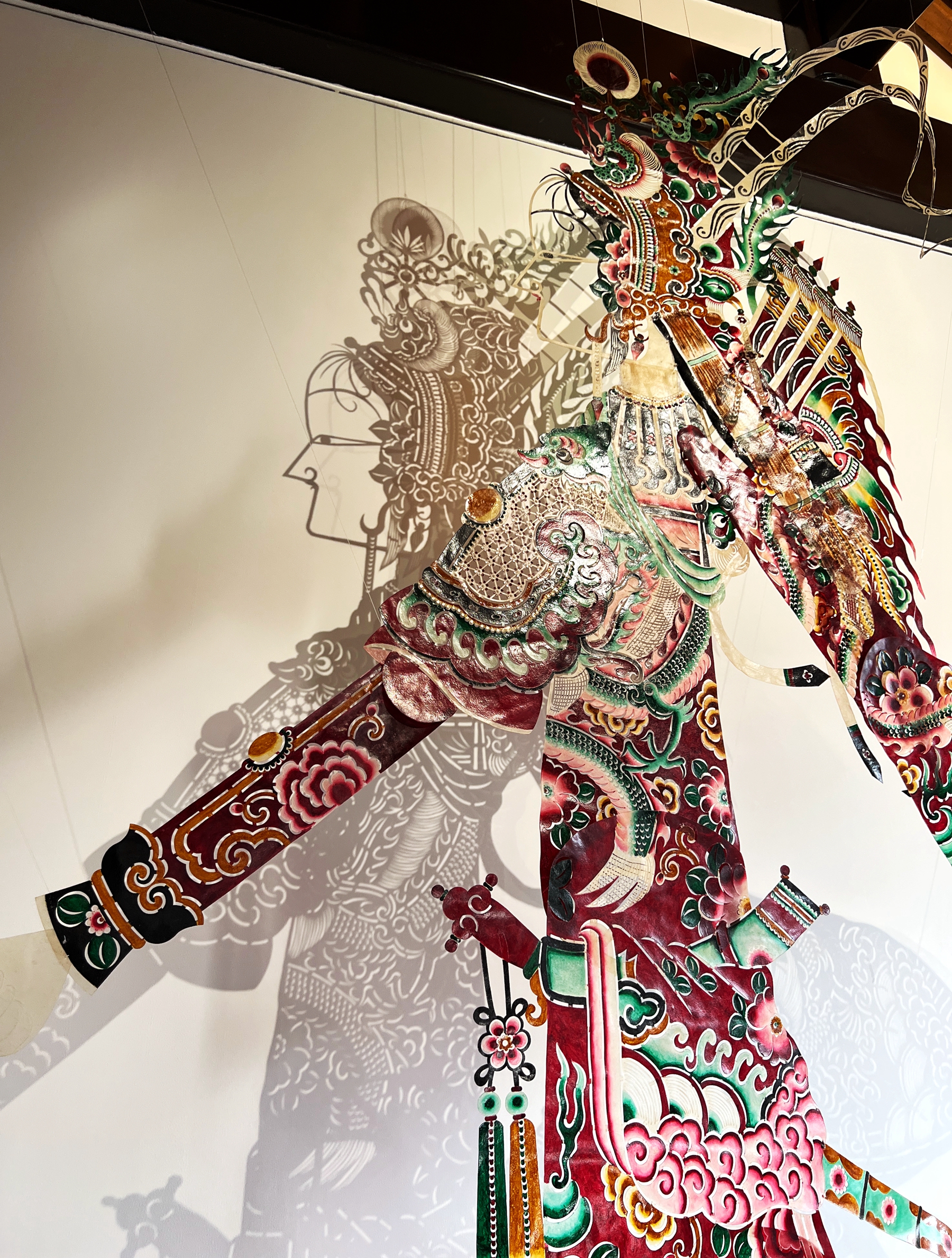 The shadow puppetry art piece titled "Peach Blossom Horse" featuring the legendary heroine image of Mu Guiying is seen on display at the "Dian Xi Yi Ben – Shadow Puppetry and Contemporary Art Exhibition" at the Nanchizi Museum in Beijing, March 2, 2025. /CGTN