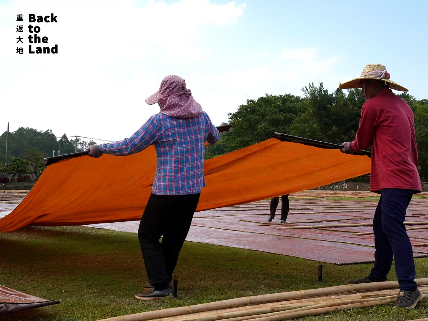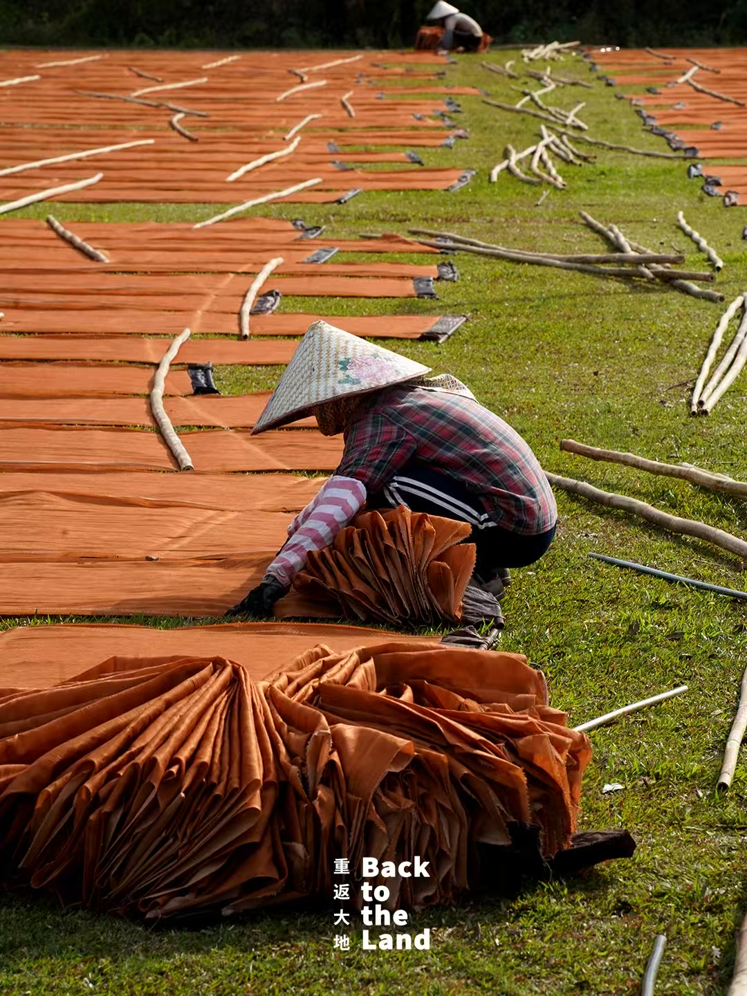 Gambiered Guangdong gauze is an art form born from the earth. Made from the Dioscorea cirrhosa plant, the delicate fabric is given its unique texture through exposure to the sun and wind. The artisans, by stretching the fabric across their fields, transform the land into a vast canvas. Using their hands as a brush, they paint flowing natural landscapes.
