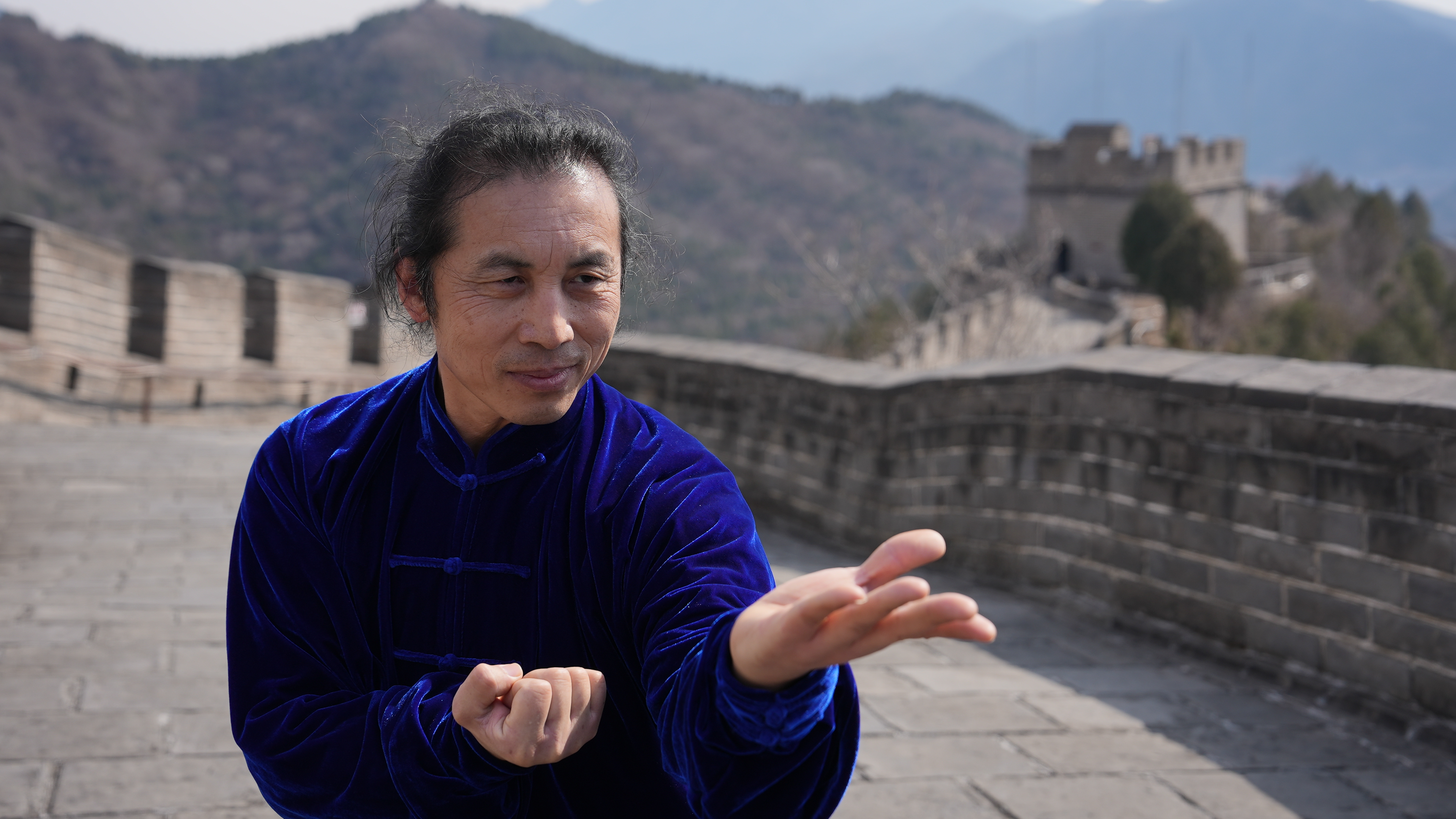 Martial art master plays tai chi boxing on Juyong Pass, March 5, 2025. /CGTN