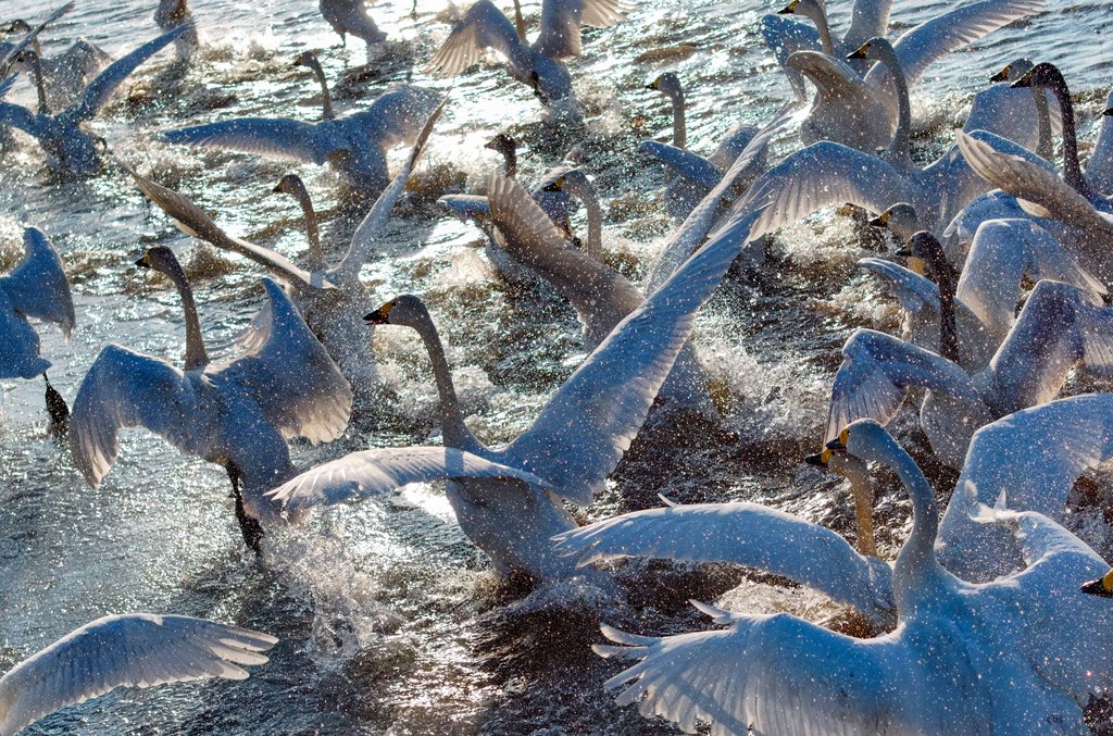Swans splash in a river in Ordos, Inner Mongolia, on March 5, 2025. /VCG