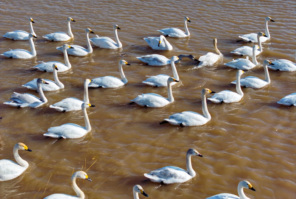 Signs of spring have arrived in Ordos, Inner Mongolia with the arrival of swans in the area. As temperatures rise, the migratory swans pass through this patch of north China, the first to be seen for the season in Shi'erlianchengxiang in Ordos's Junggar Banner. Teeming along a river, they swim to and fro while basking in the sunlight.