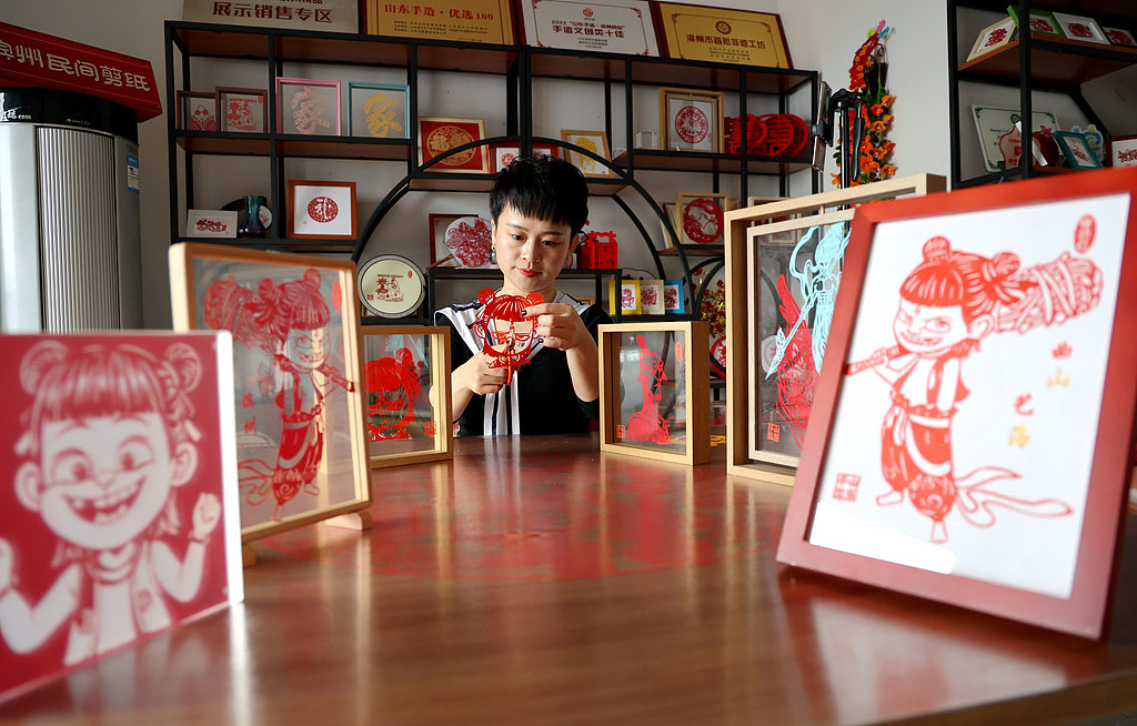 Lin Feifei displays her Ne Zha-themed paper cuttings in her studio in Binzhou, Shandong Province. /VCG