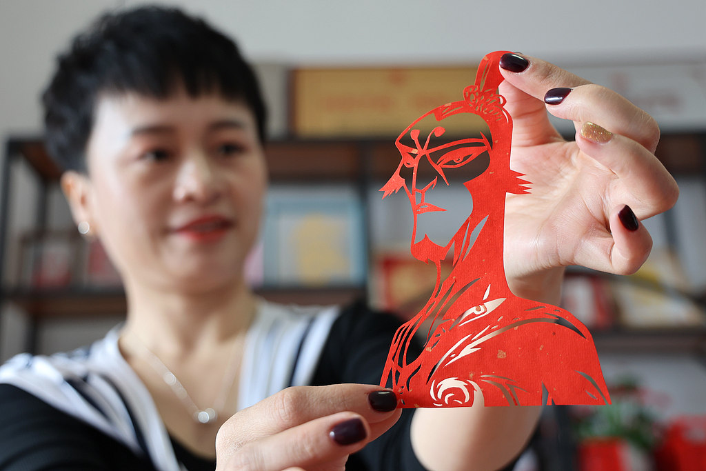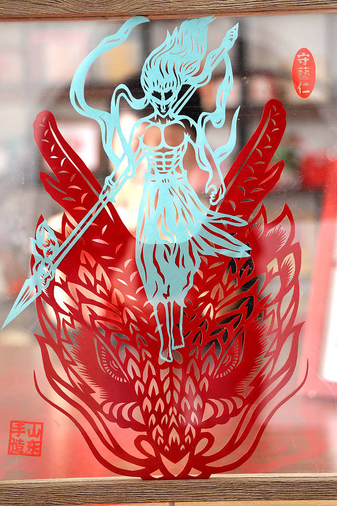 Lin Feifei displays her paper cuttings of Ne Zha and Ao Bing in her studio in Binzhou, Shandong Province. /VCG