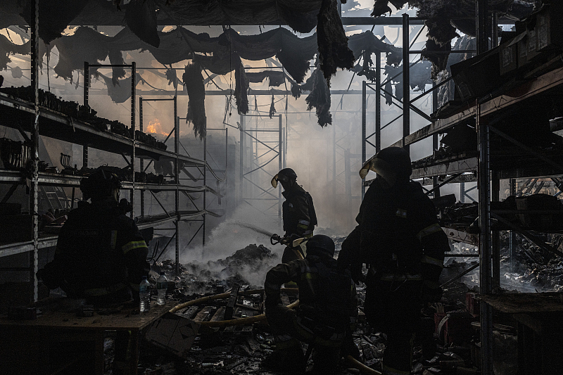 Firefighters extinguish a fire at a warehouse hit by Russian shelling in Kramatorsk, Ukraine, March 6, 2025. /VCG