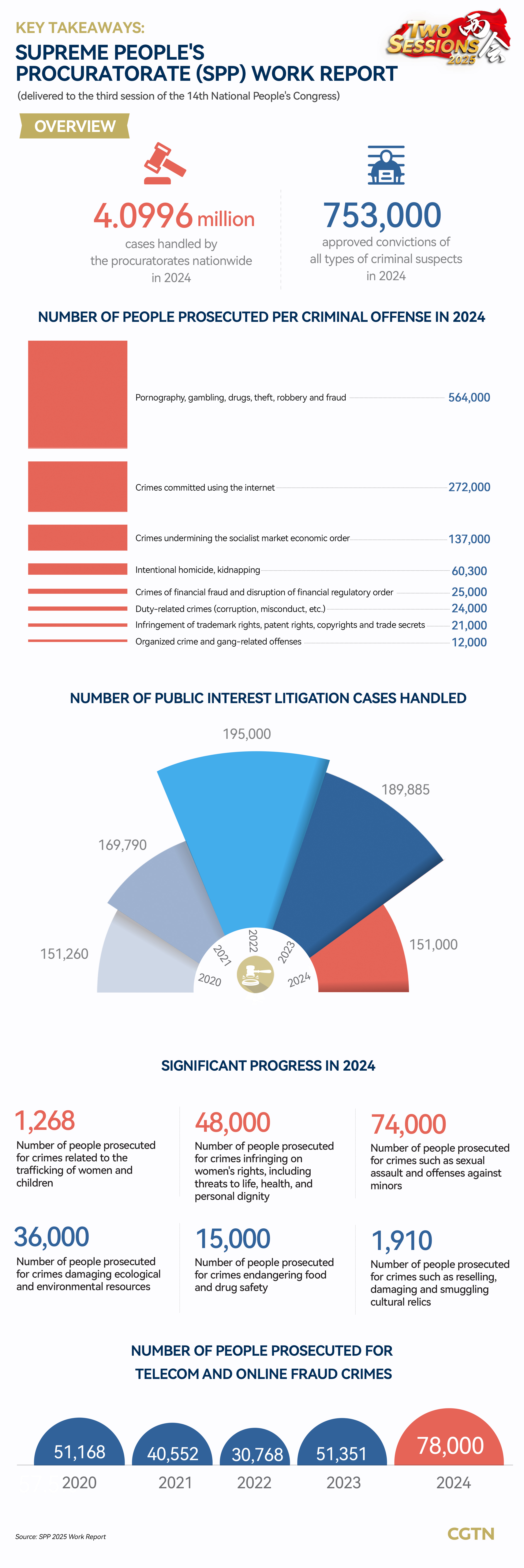 The report outlines the procuratorial authorities' nationwide work over the past year and highlights their key priorities for 2025. CGTN analyzed the key figures from the SPP work report in the following graphic.
