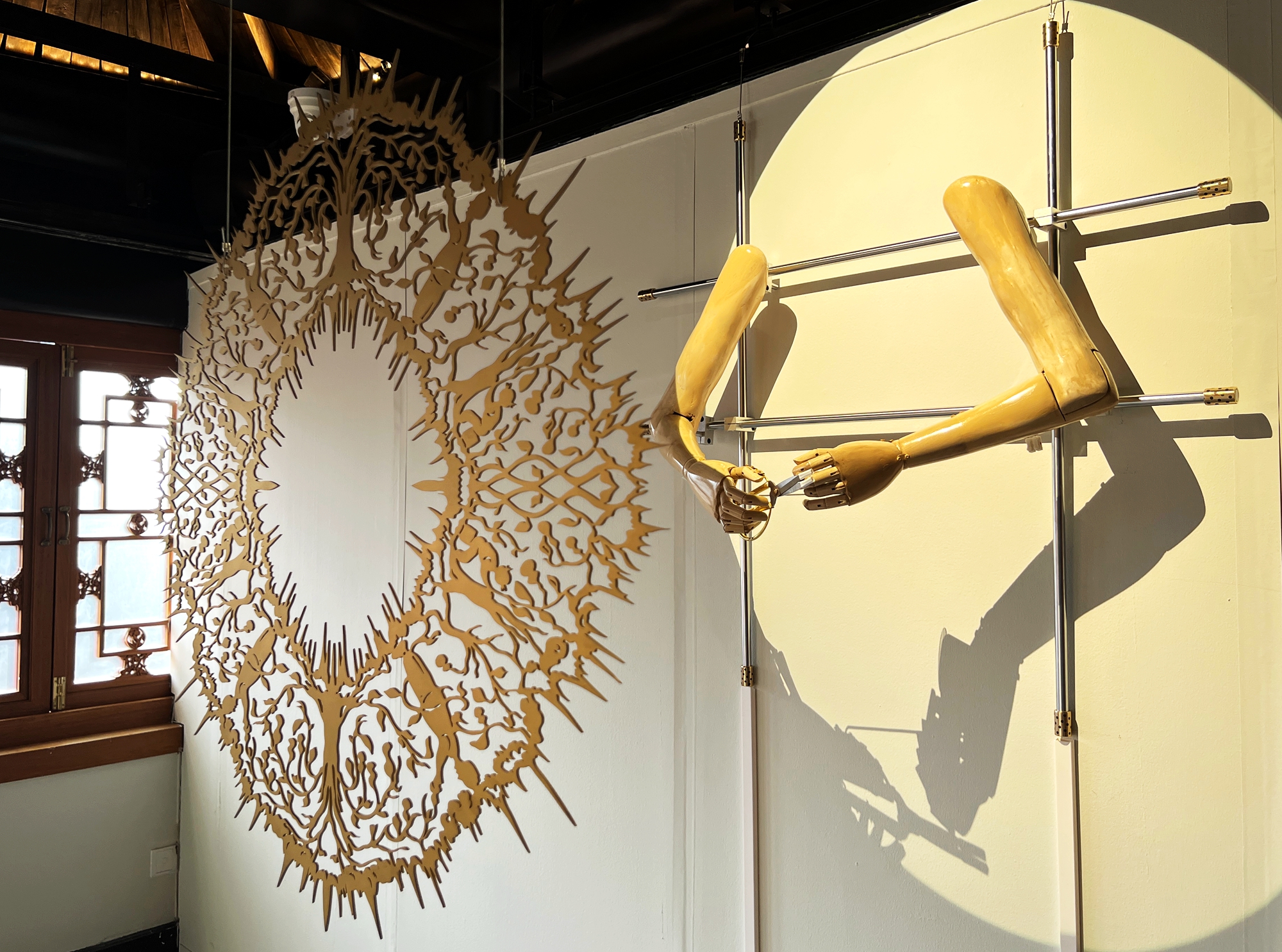 The artwork "Well Thought-Out Strategy" is a dynamic installation in which a wooden mechanical arm repeatedly performs a paper-cutting action. This creative piece is now on display at the "Dian Xi Yi Ben – Shadow Puppetry and Contemporary Art Exhibition" at Nanchizi Museum in Beijing.