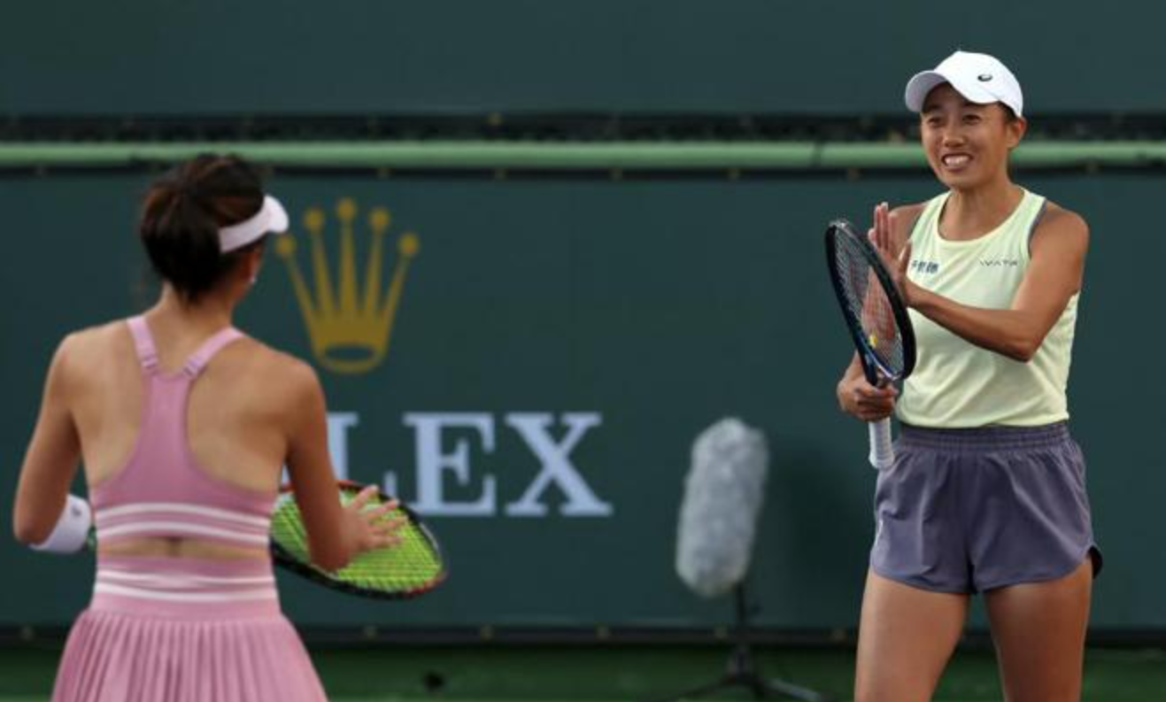 Zhang Shuai (R) of China reacts after scoring a point pairing with Hsieh Su-wei of Chinese Taipei in the women's doubles match against Makenna Jones and McCartney Kessler of the U.S. at the BNP Paribas Open in Indian Wells, California, March 9, 2025. /Sina Weibo