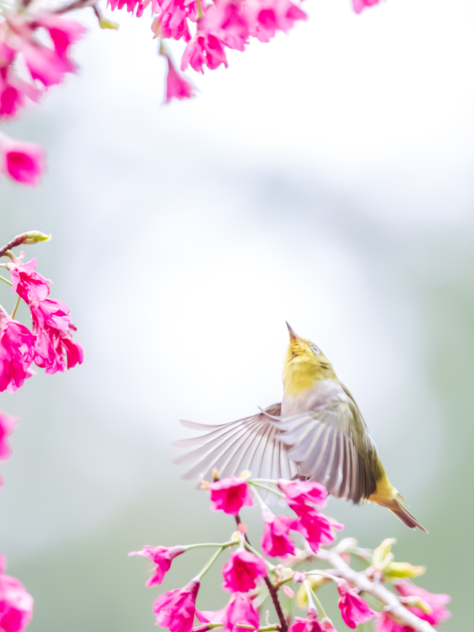 As cherry blossoms paint Nanchang in soft hues of pink, a tiny Swinhoe's white-eye flits among the blossoms. With its yellow-olive plumage and signature white eye-ring, this feathered visitor weaves through the branches, pausing to sip nectar before taking flight – adding a touch of springtime magic to the scene.