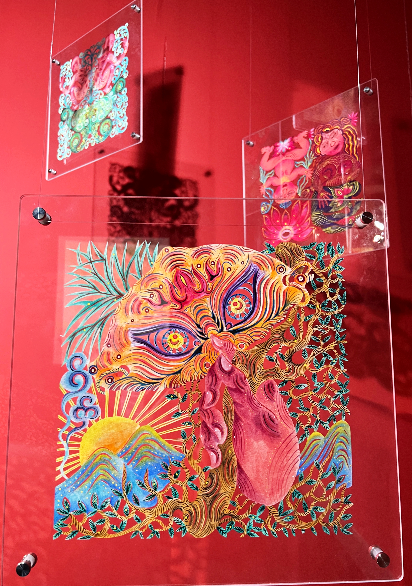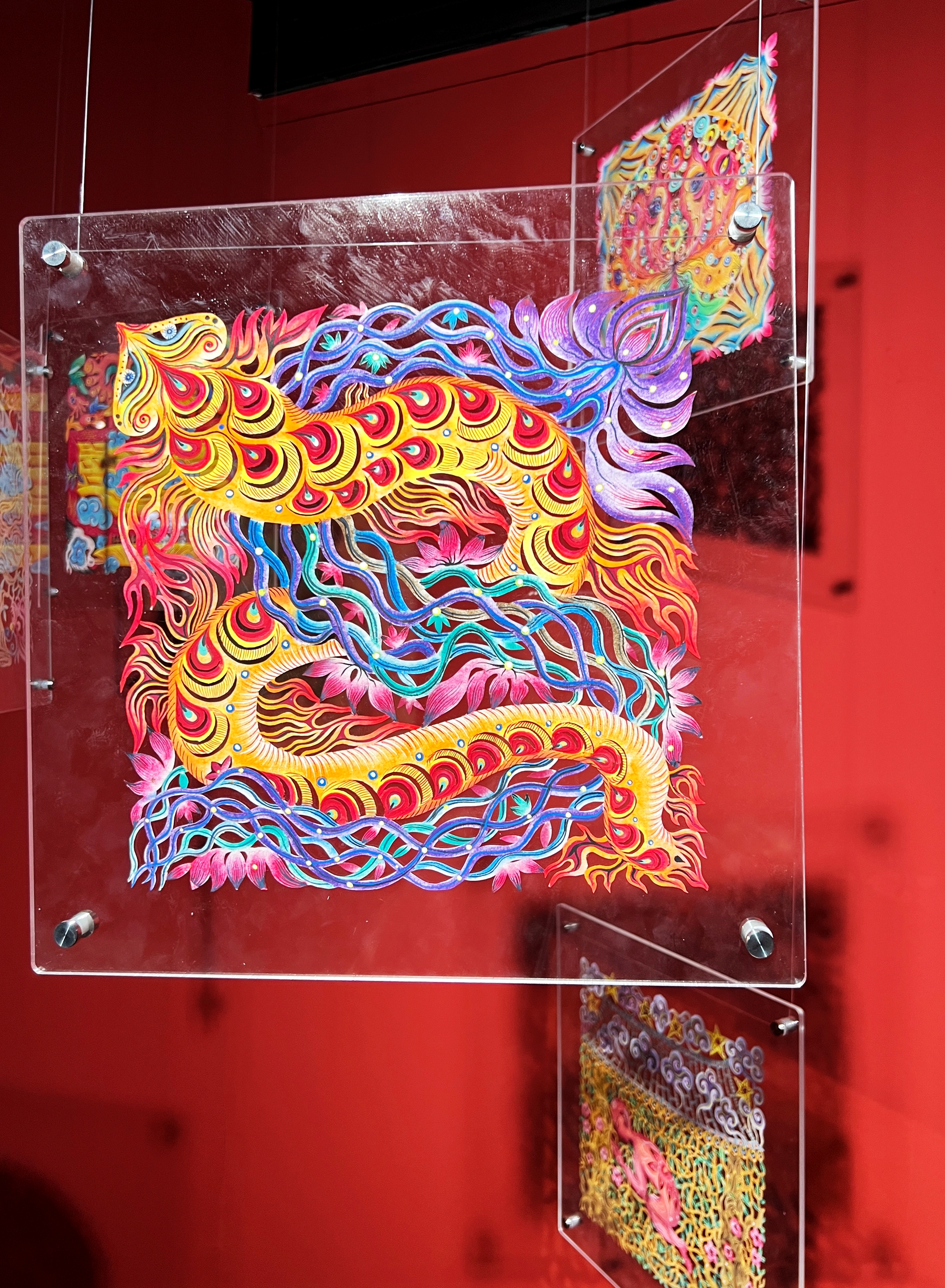 Dyed paper cutting artwork "The Thousand Character Patterns Project" is seen at the "Dian Xi Yi Ben – Shadow Puppetry and Contemporary Art Exhibition" at Nanchizi Museum in Beijing, March 2, 2025. /CGTN