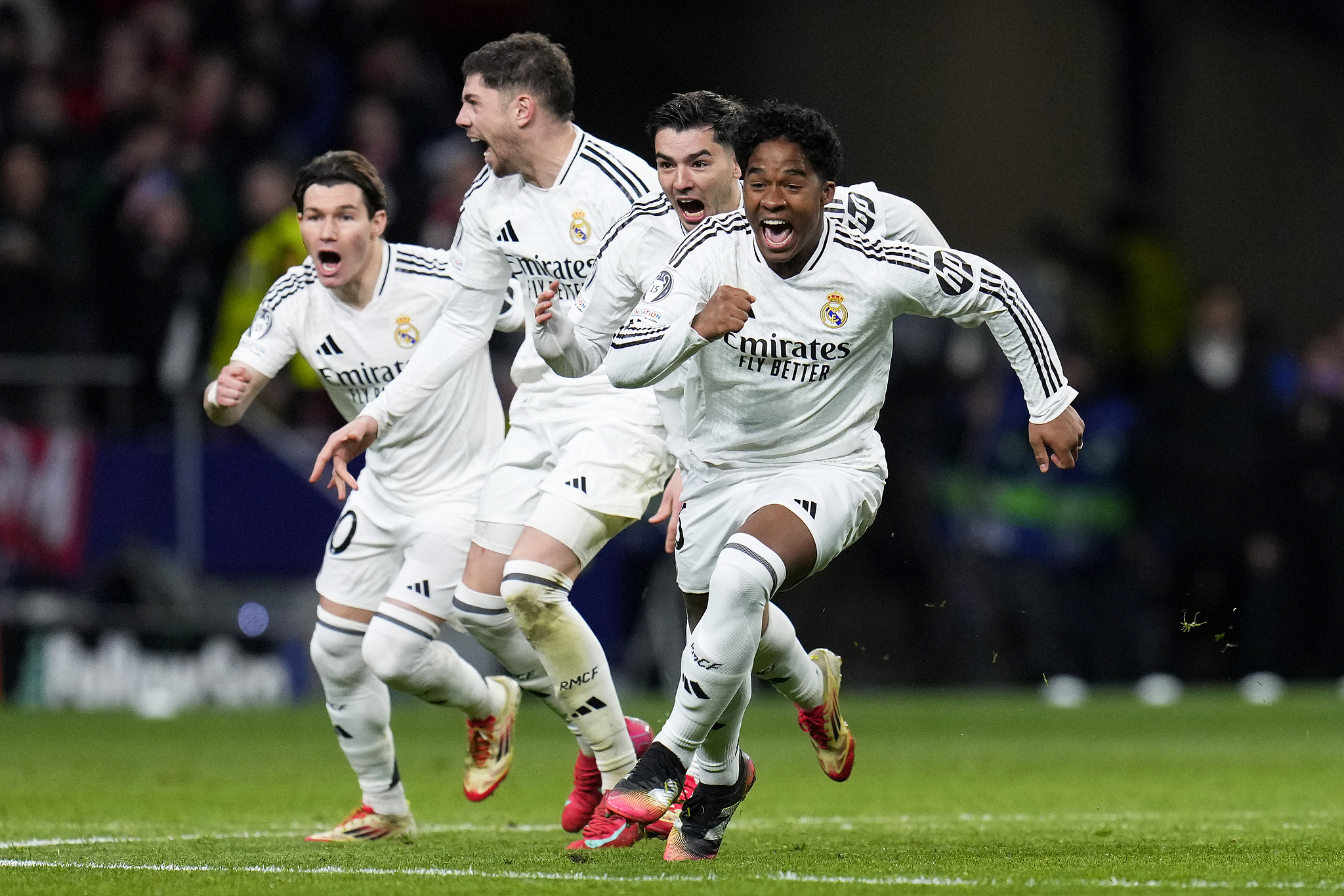 Real Madrid players celebrate after defeating Atletico Madrid 4-2 on spot kicks in a UEFA Champions League round of 16 second leg match at the Metropolitano Stadium in Madrid, Spain, March 12, 2025. /VCG