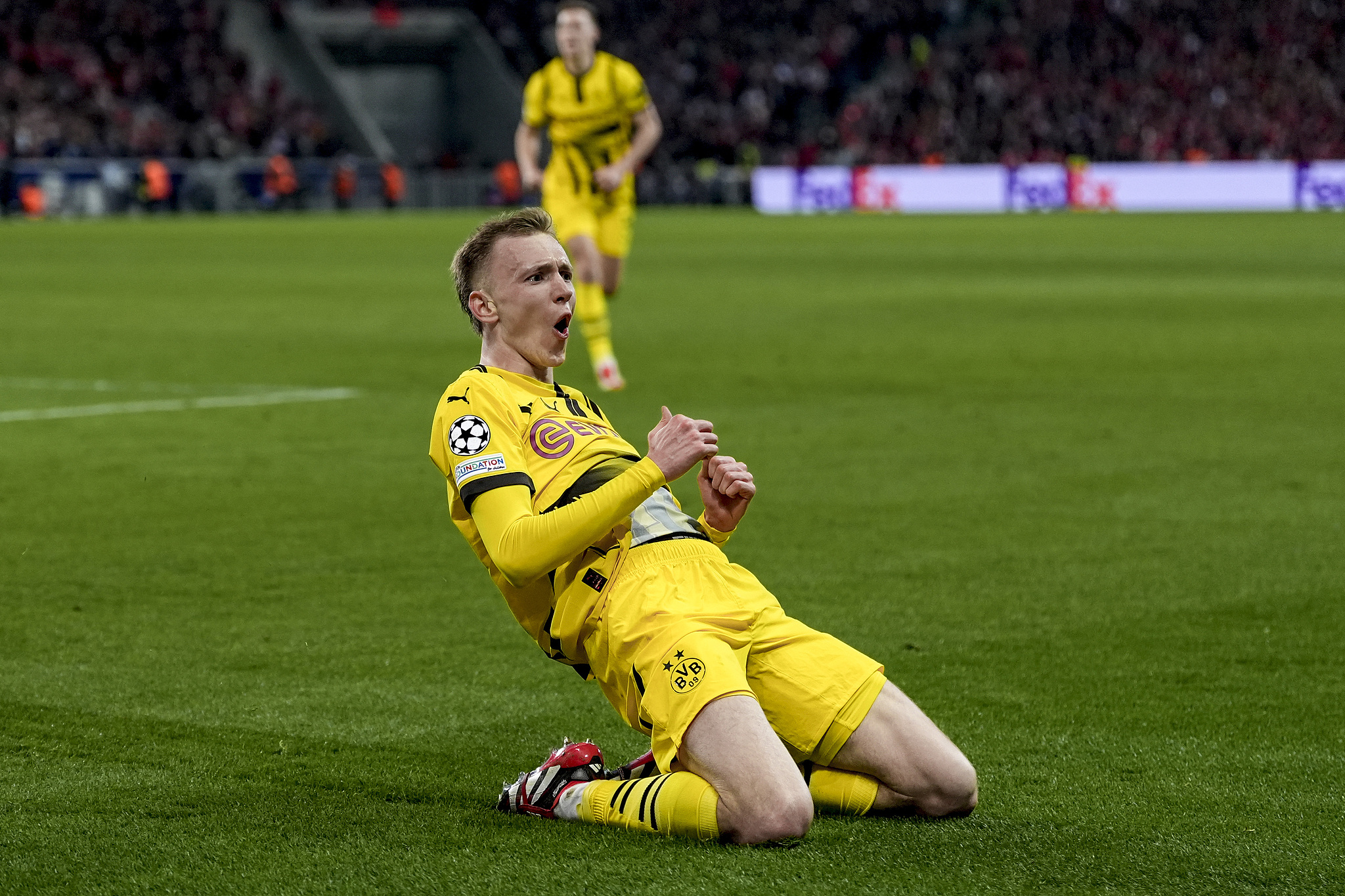 Maximilian Beier of Borussia Dortmund celebrates after scoring a goal against Lille in a UEFA Champions League round of 16 second leg match at the Stade Pierre-Mauroy in Lille, France, March 12, 2025. /VCG
