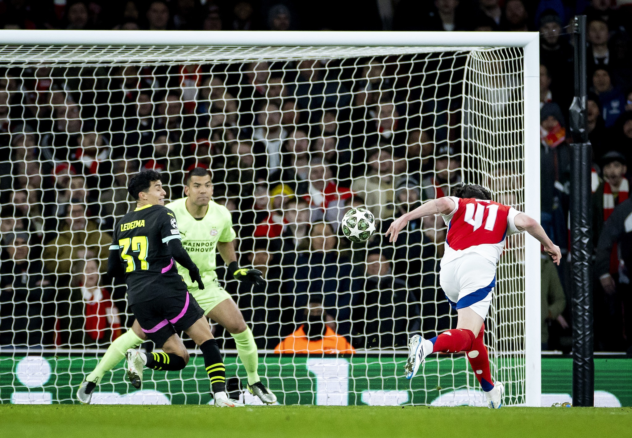 Declan Rice (#41) of Arsenal scores a header against PSV Eindhoven in a UEFA Champions League round of 16 second leg match at the Emirates Stadium in London, England, March 12, 2025. /VCG