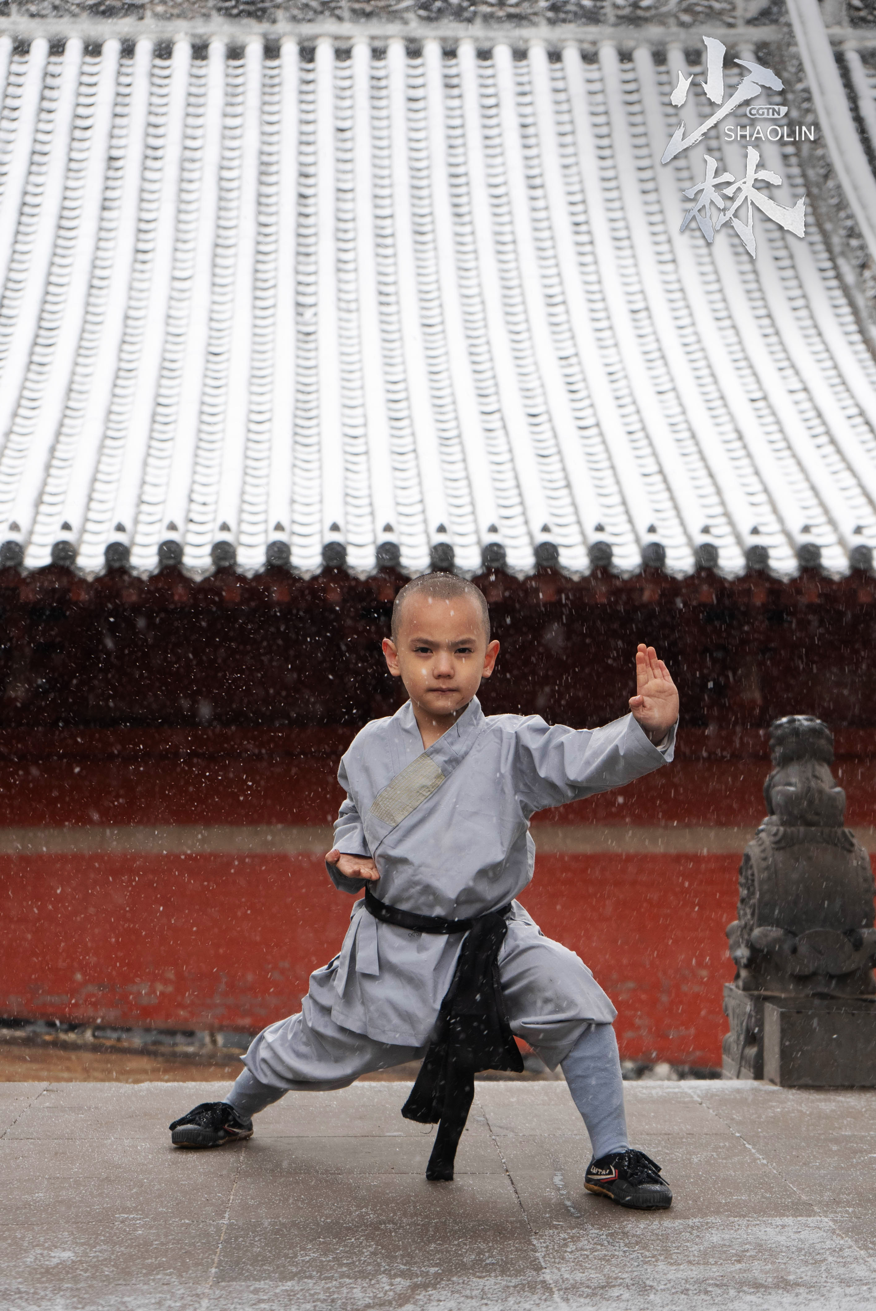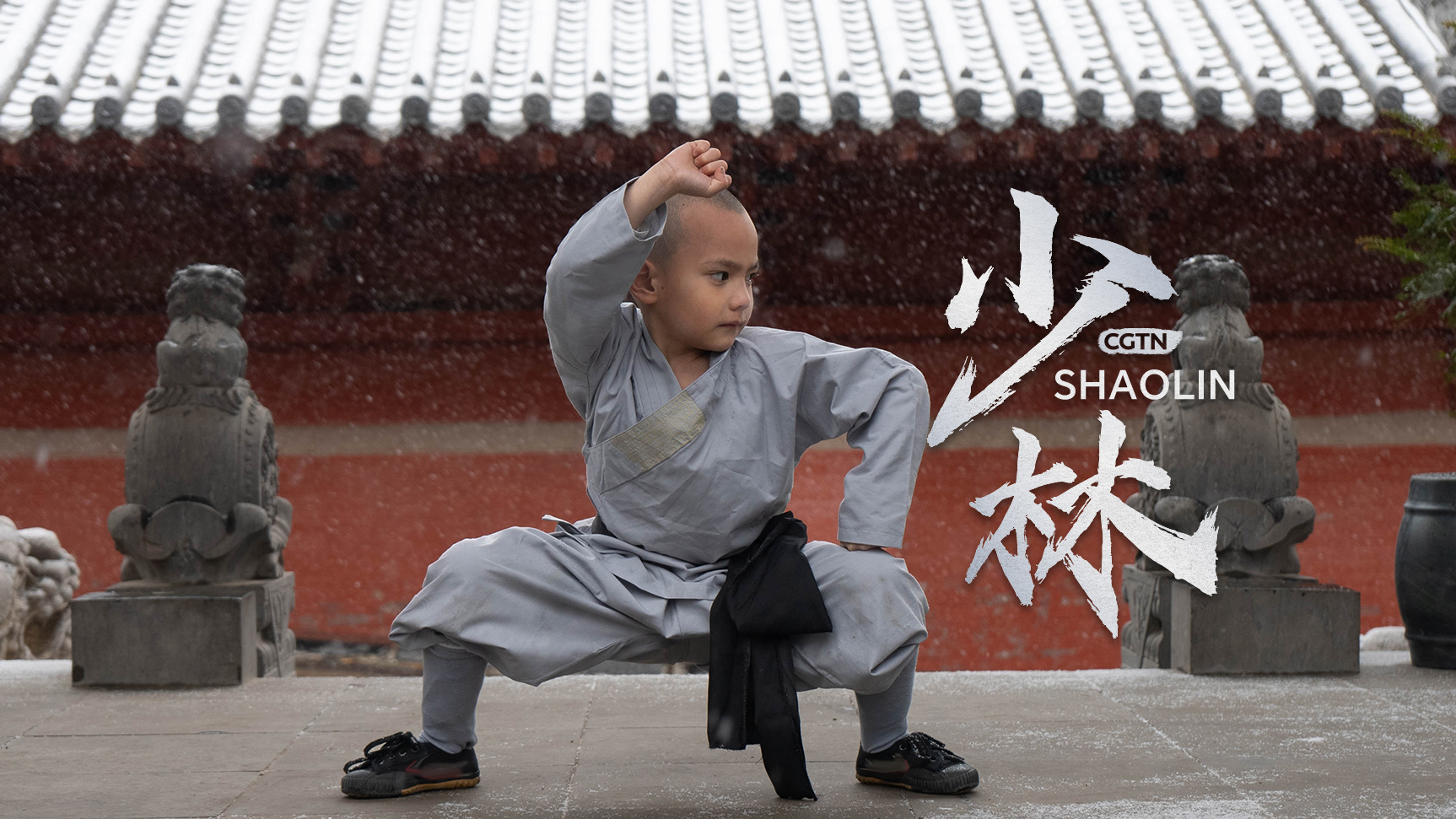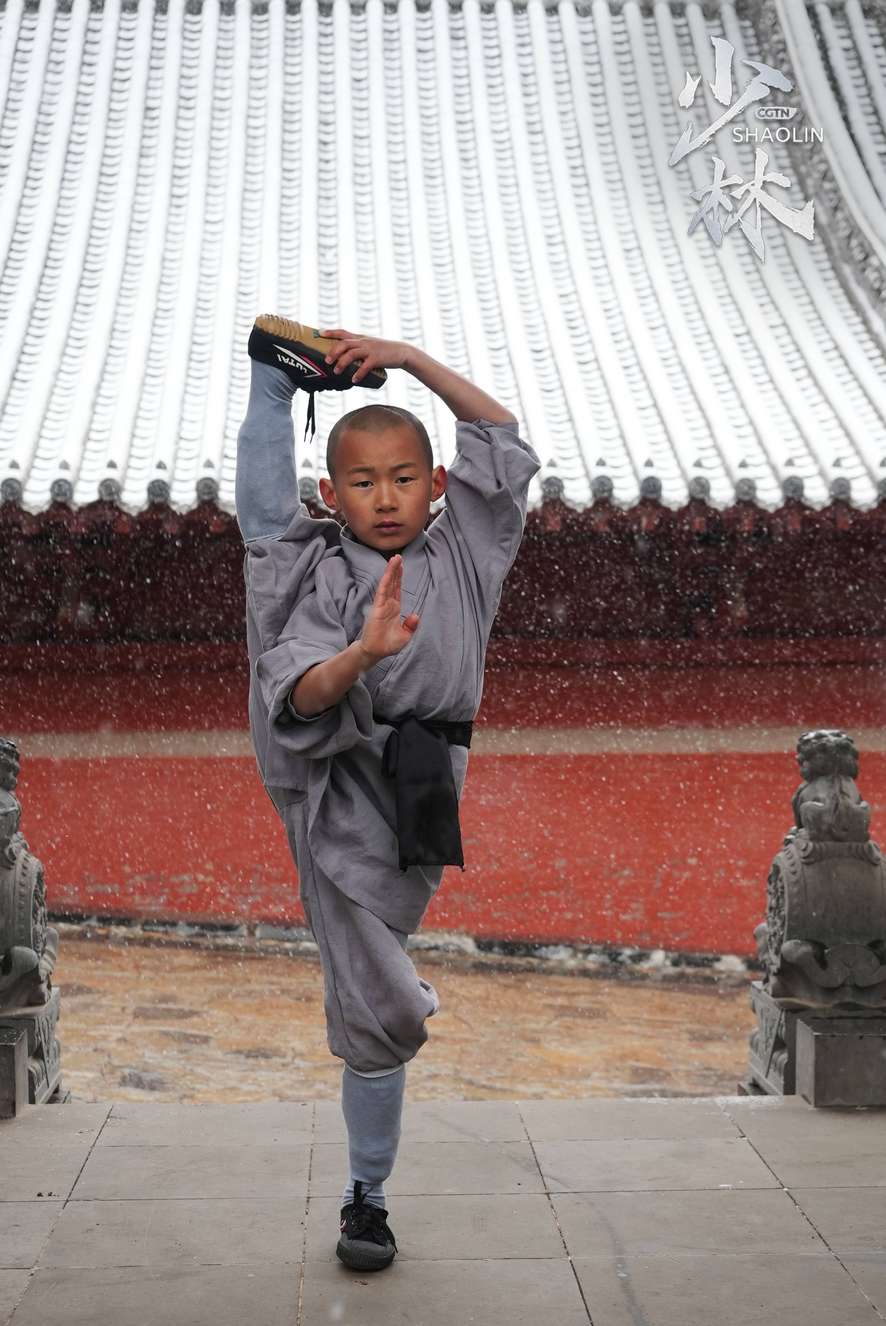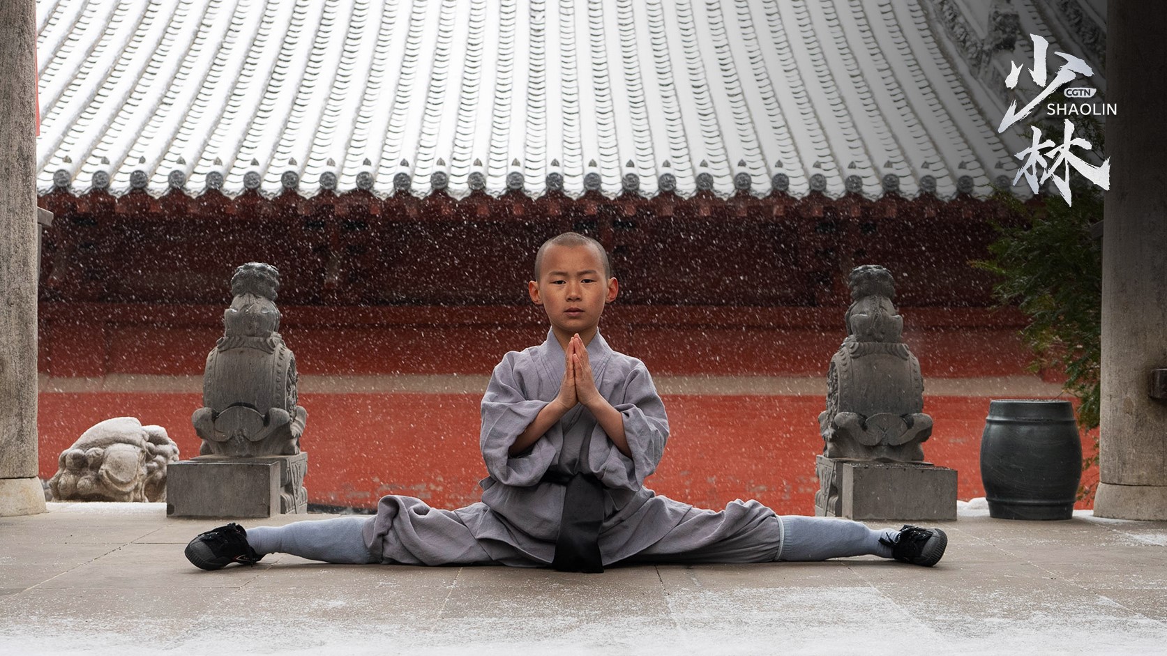 Liu Congzhi, a six-year-old boy who has studied kung fu for two years, makes a pose at Shaolin Temple, Zhengzhou, central China's Henan Province, March 3, 2025. /CGTN