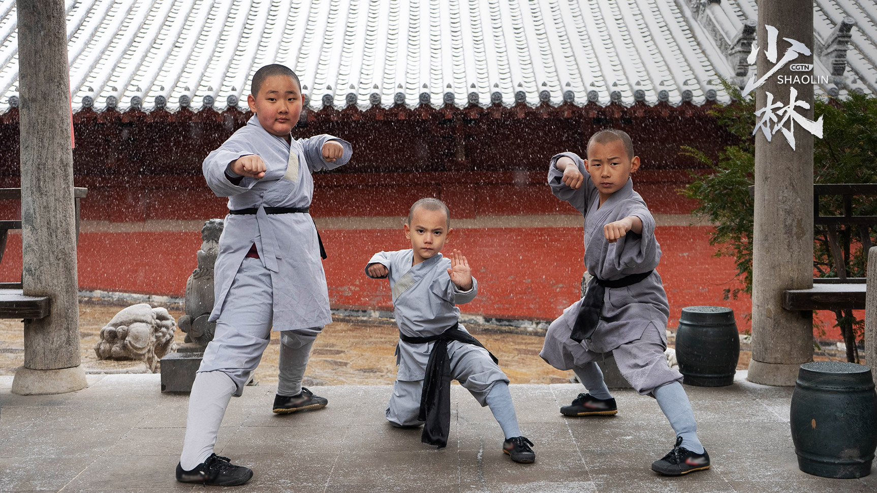 Within the ancient walls of Shaolin Temple in Dengfeng, a county-level city in Zhengzhou City, central China's Henan Province, a tranquil scene unfolds. Several Shaolin kung fu practitioners display their poses amidst a gentle snowfall near Xiangyin Pavilion in the temple.