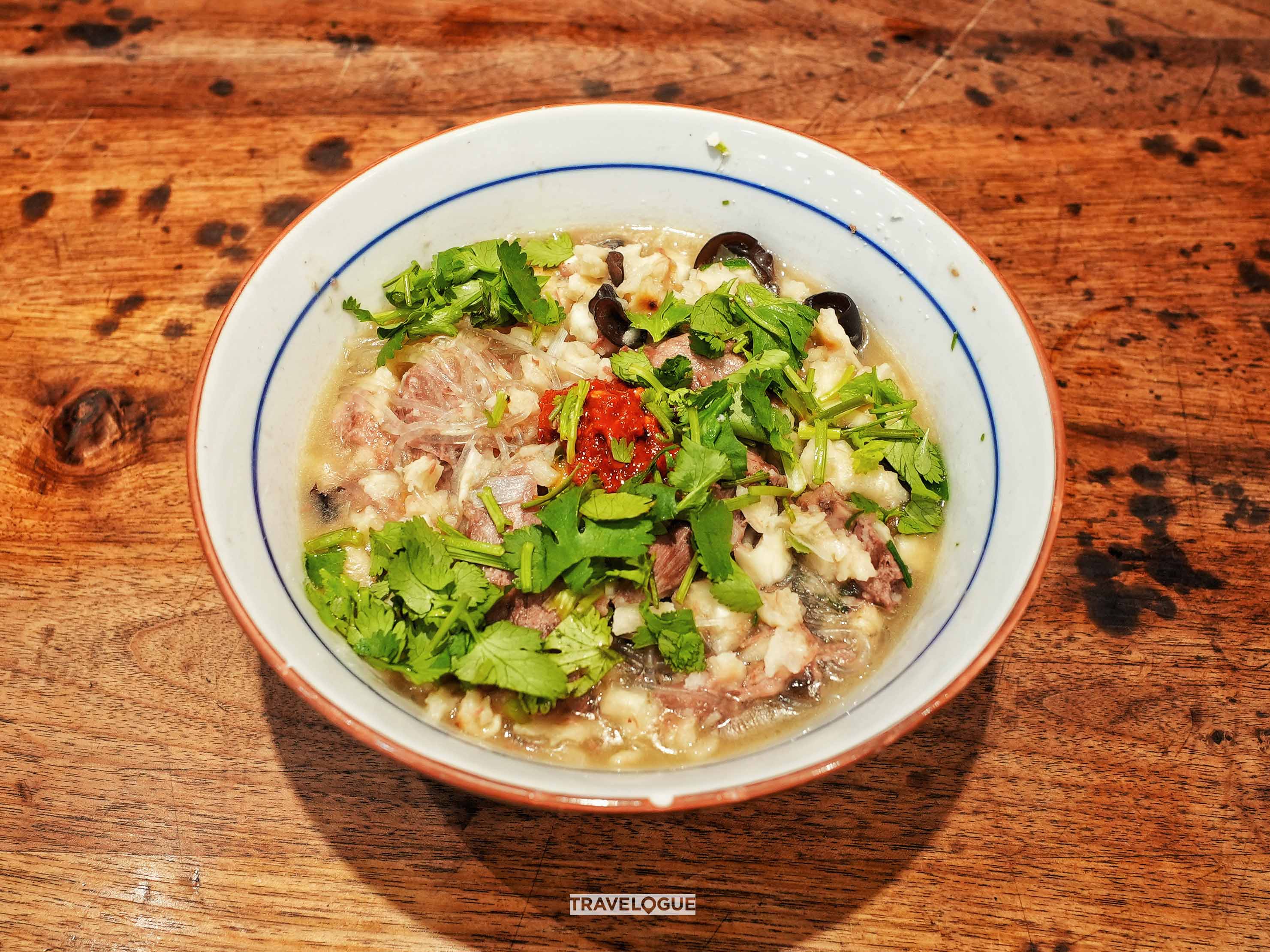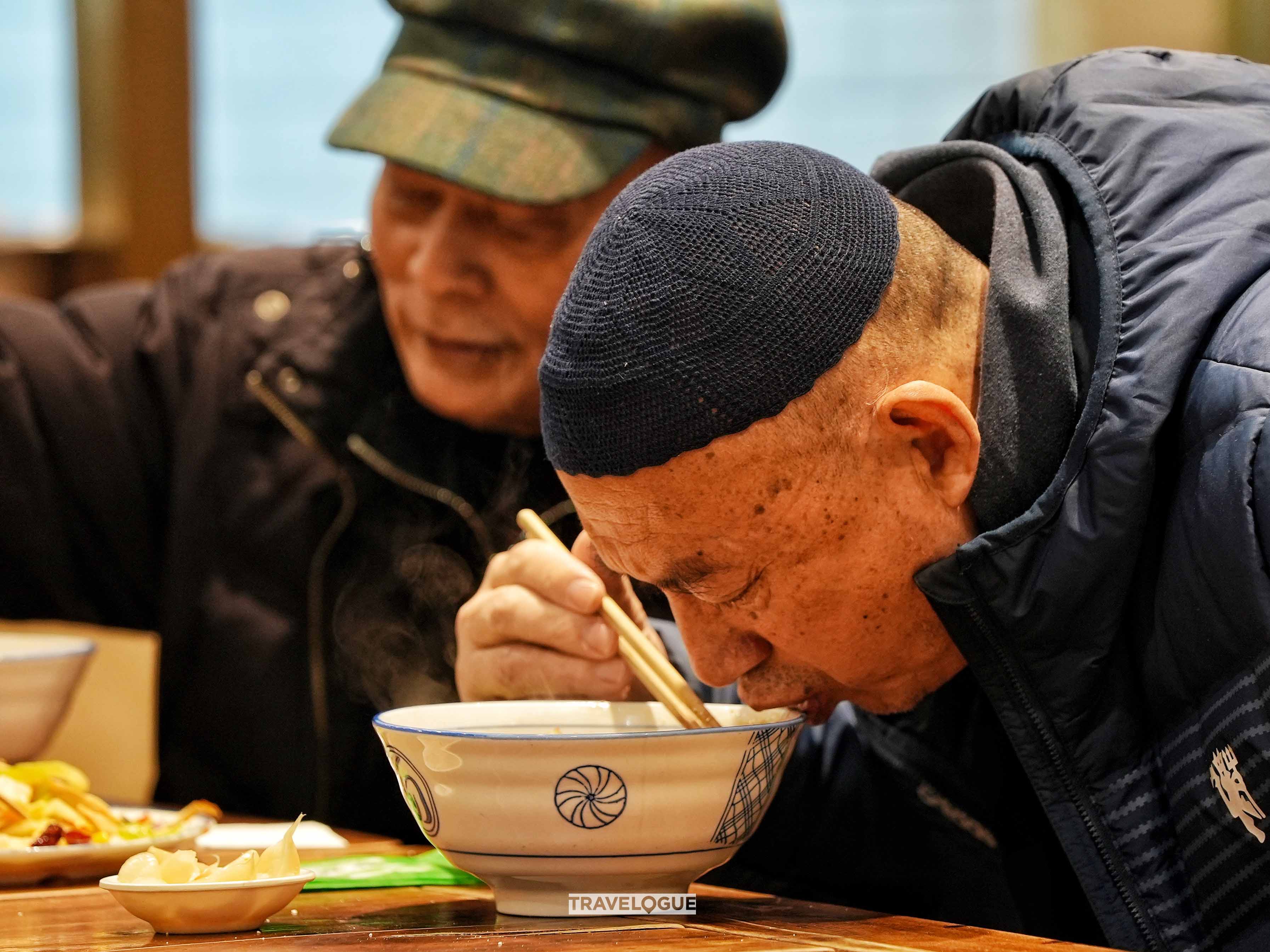 The proper way to eat "yangrou paomo" is to first tear off fingernail-sized pieces of flatbread to use as croutons in your stew, then bring the bowl up to your lips and slurp up the hot soup. Newbies be warned: Your fingers and lips may hurt afterwards!