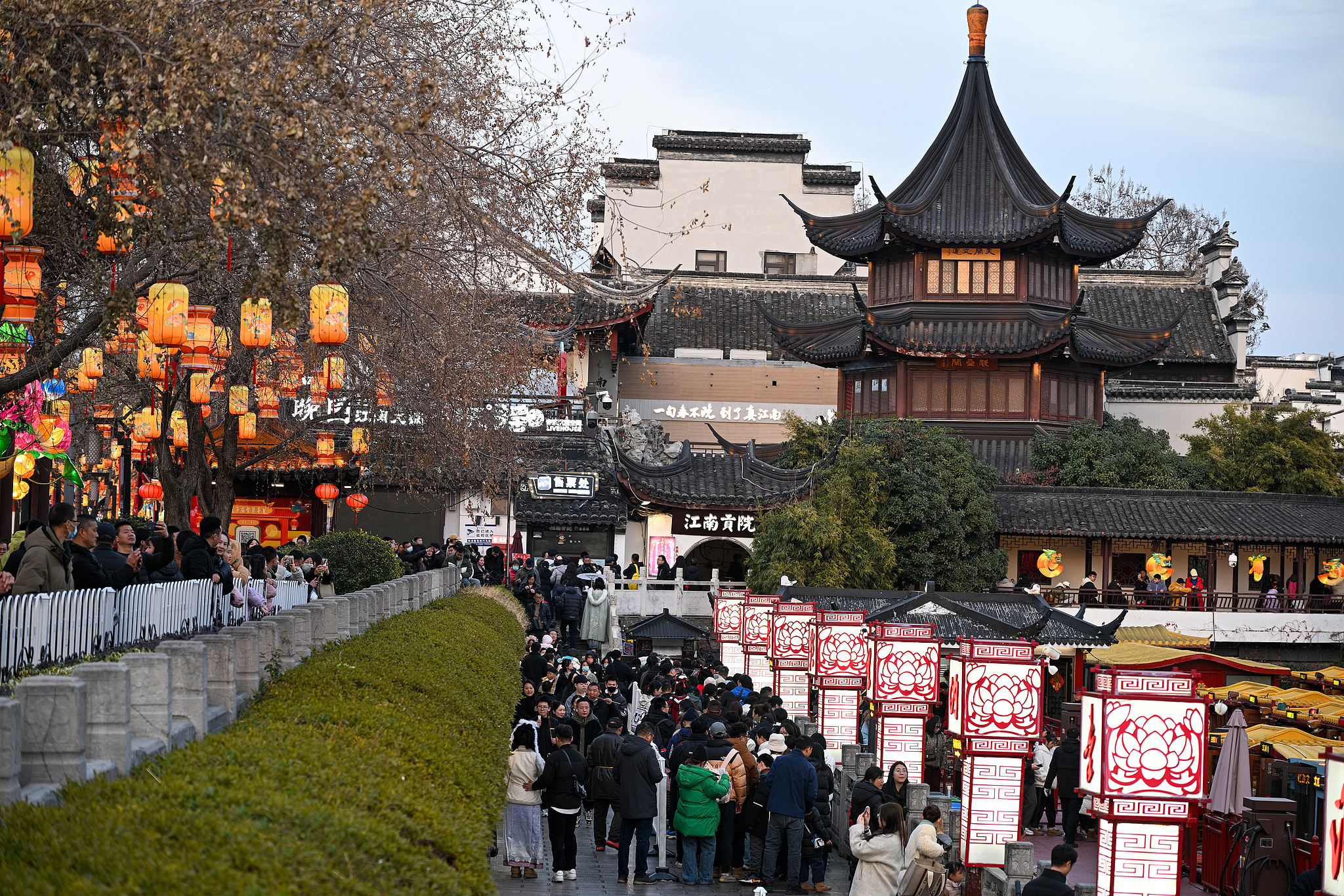 Tourists visit the Fuzi Temple in Qinhuai District of Nanjing, the capital of Jiangsu Province in east China, February 6, 2025. /VCG