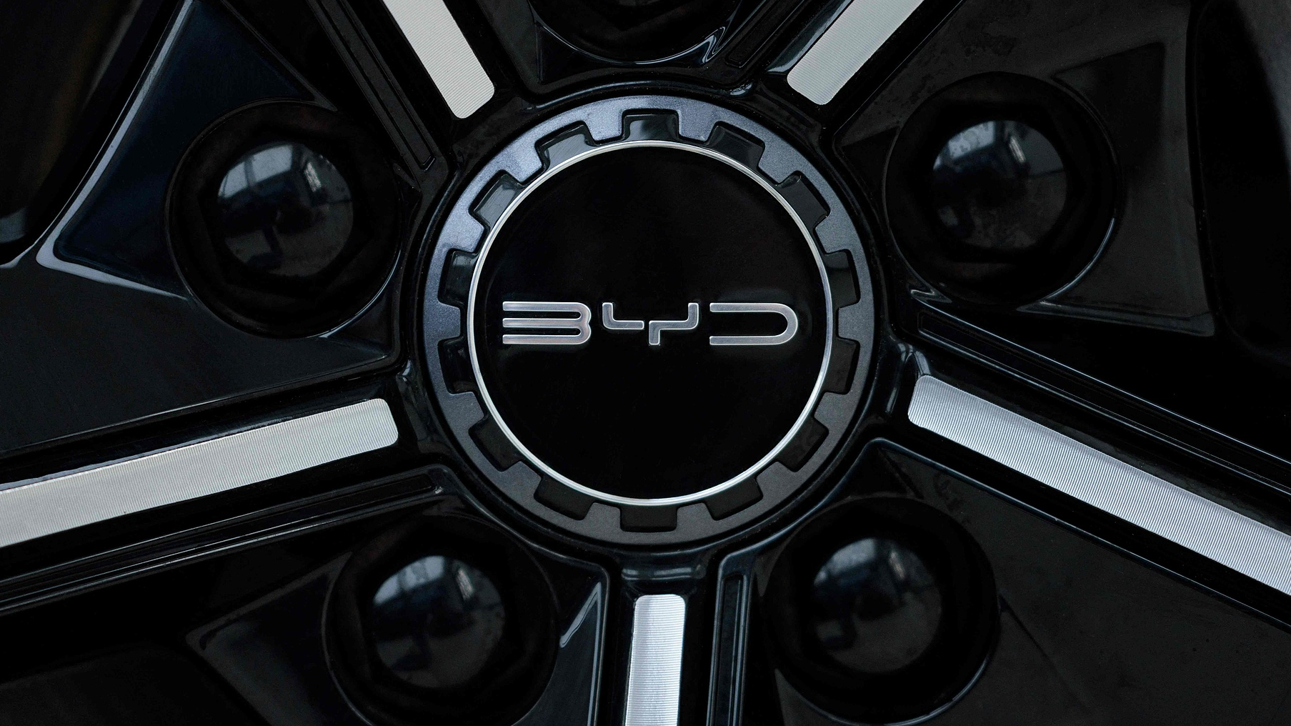 A BYD logo on a wheel of a car in a dealership in Paris, France, March 20, 2025. /VCG