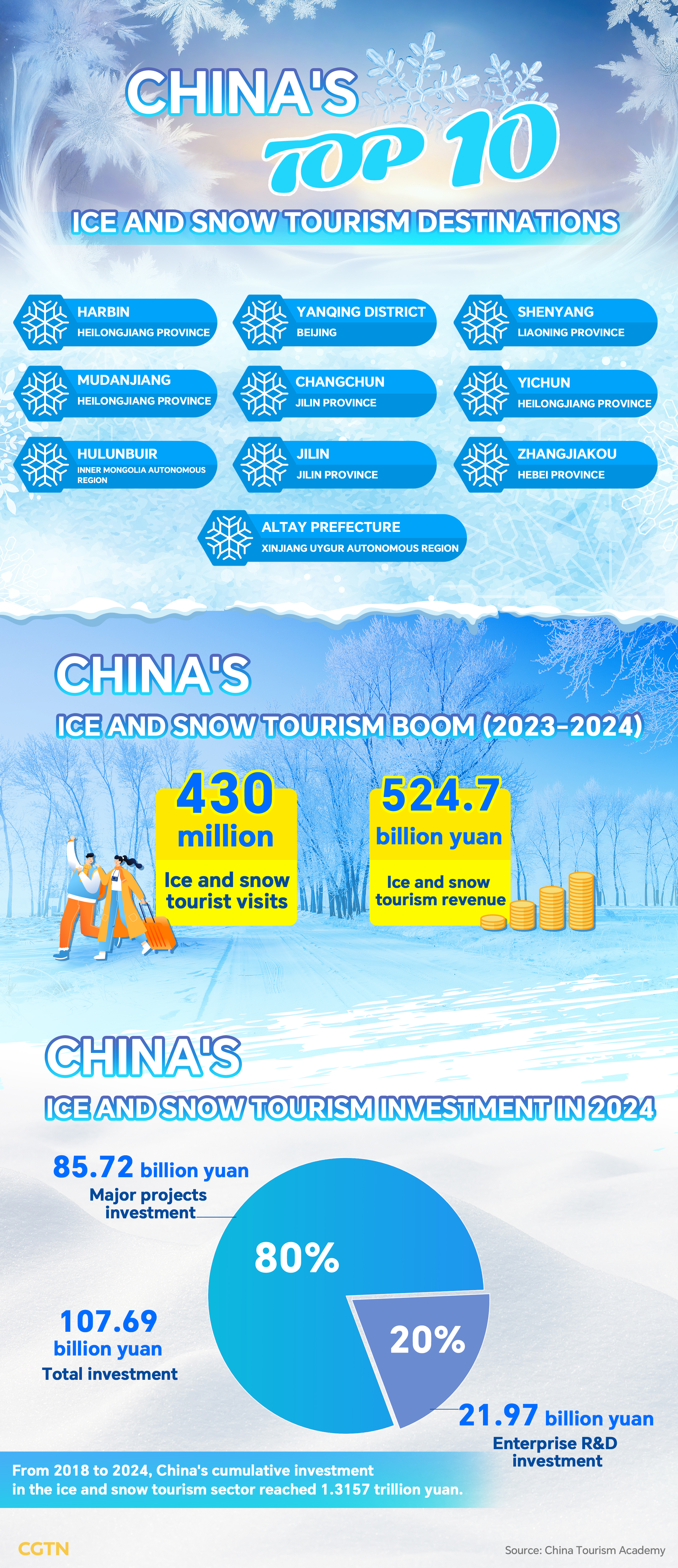 Data from the China Tourism Academy shows that in the 2023–2024 ice and snow season, China's ice and snow activities had 430 million tourist visits, generating a total tourism revenue of 524.7 billion yuan ($72.39 billion). Between 2018 and 2024, the country's total investment in the ice and snow tourism industry amounted to 1.3157 trillion yuan ($181.51 billion).