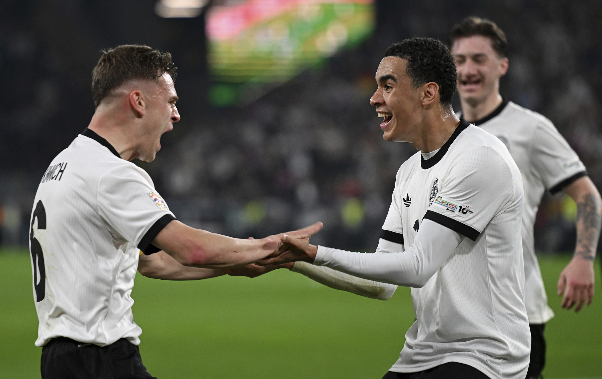 Germany's Jamal Musiala (R) celebrates his goal with Joshua Kimmich during the UEFA Nations League quarterfinal second leg football match North Rhine-Westphalia, Dortmund, Germany, March 23, 2025. /VCG