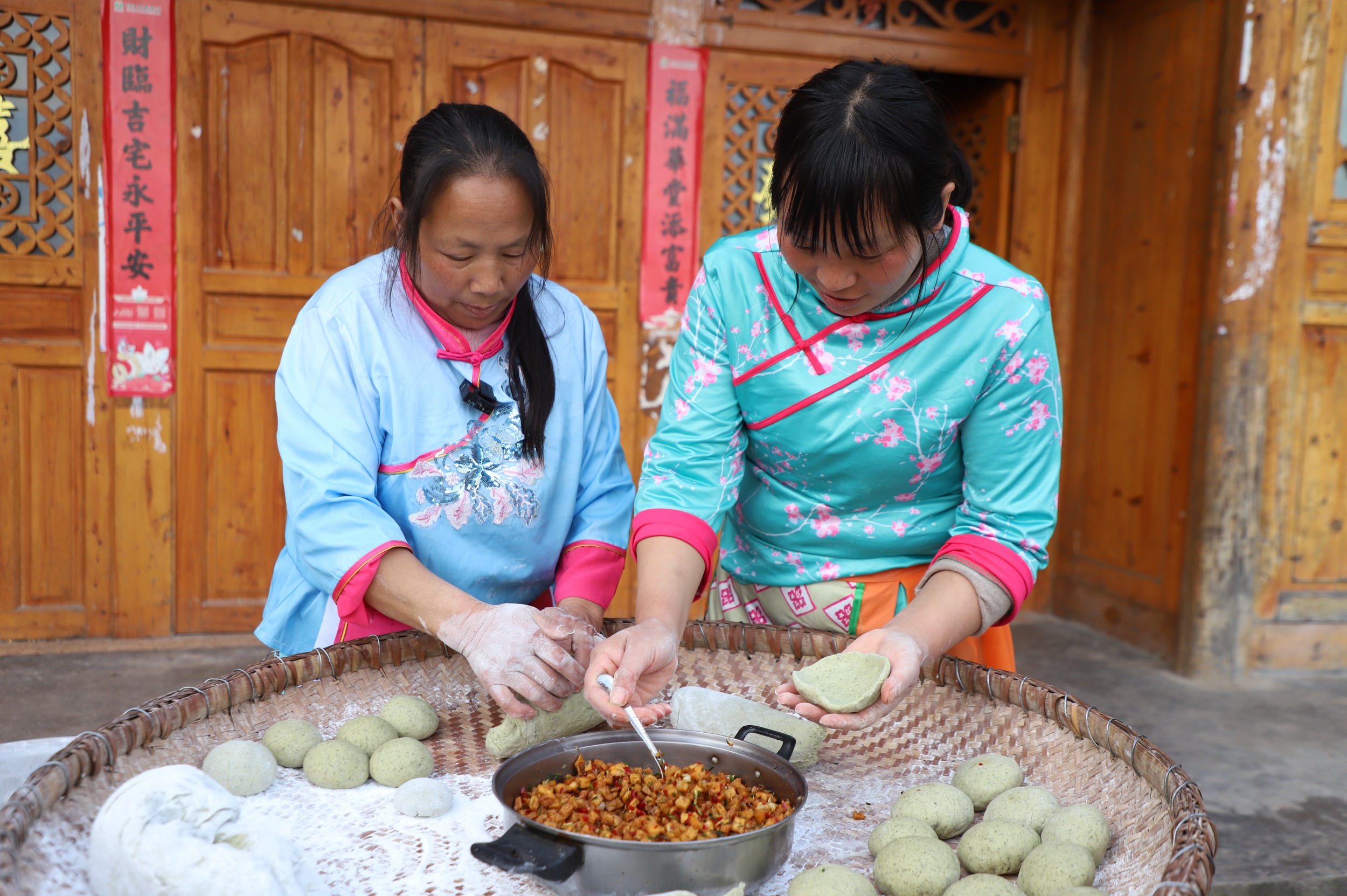 People wrap deep-fried tofu cubes, wild onions, and chili peppers into dough balls to make Qingming Cake in Yinjiang Tujia and Miao Autonomous County, southwest China's Guizhou Province, on March 19, 2025. /Photo provided to CGTN