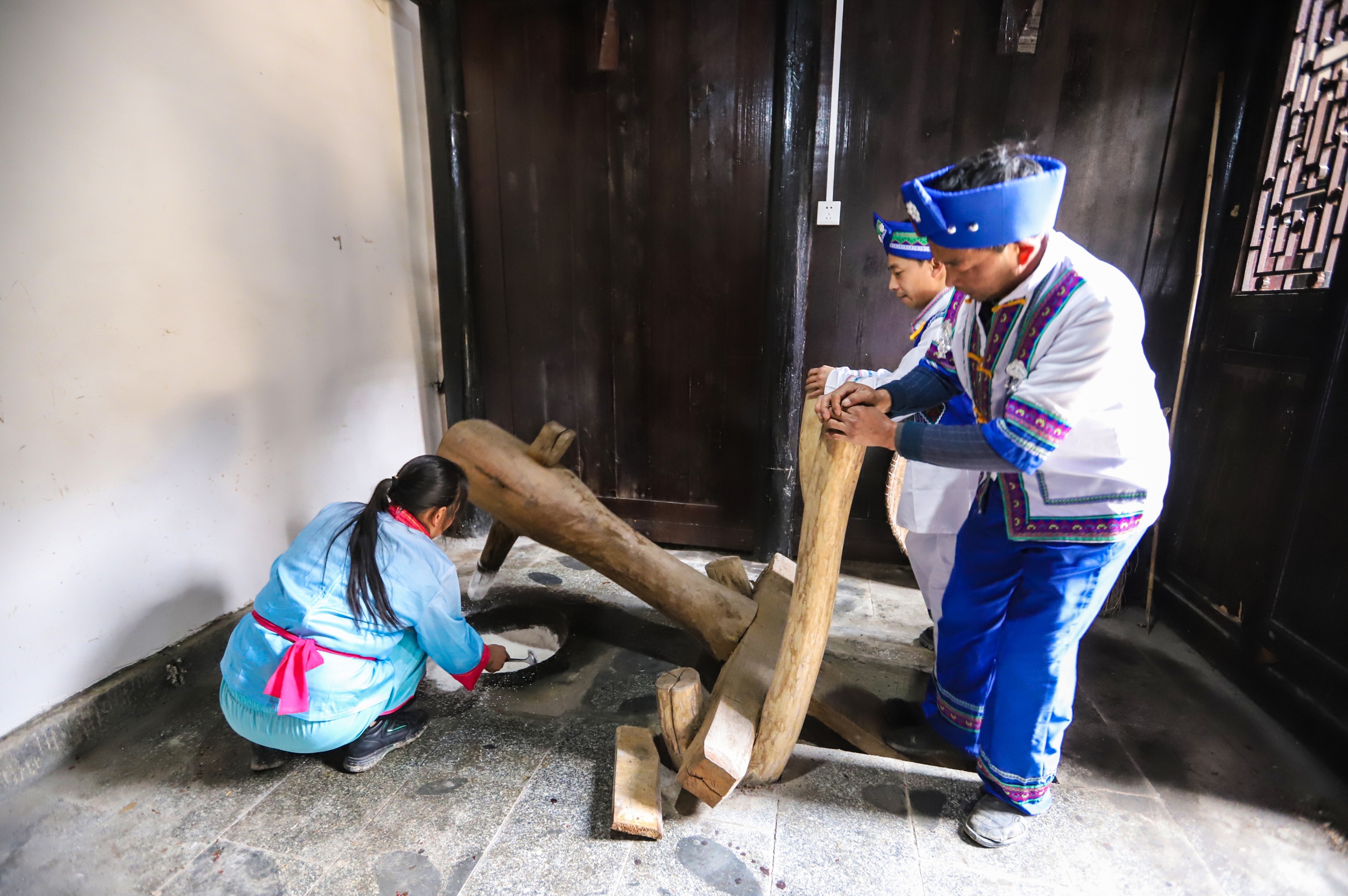 People pound glutinous rice and cudweed together to make Qingming Cake in Yinjiang Tujia and Miao Autonomous County, southwest China's Guizhou Province, on March 19, 2025. /Photo provided to CGTN