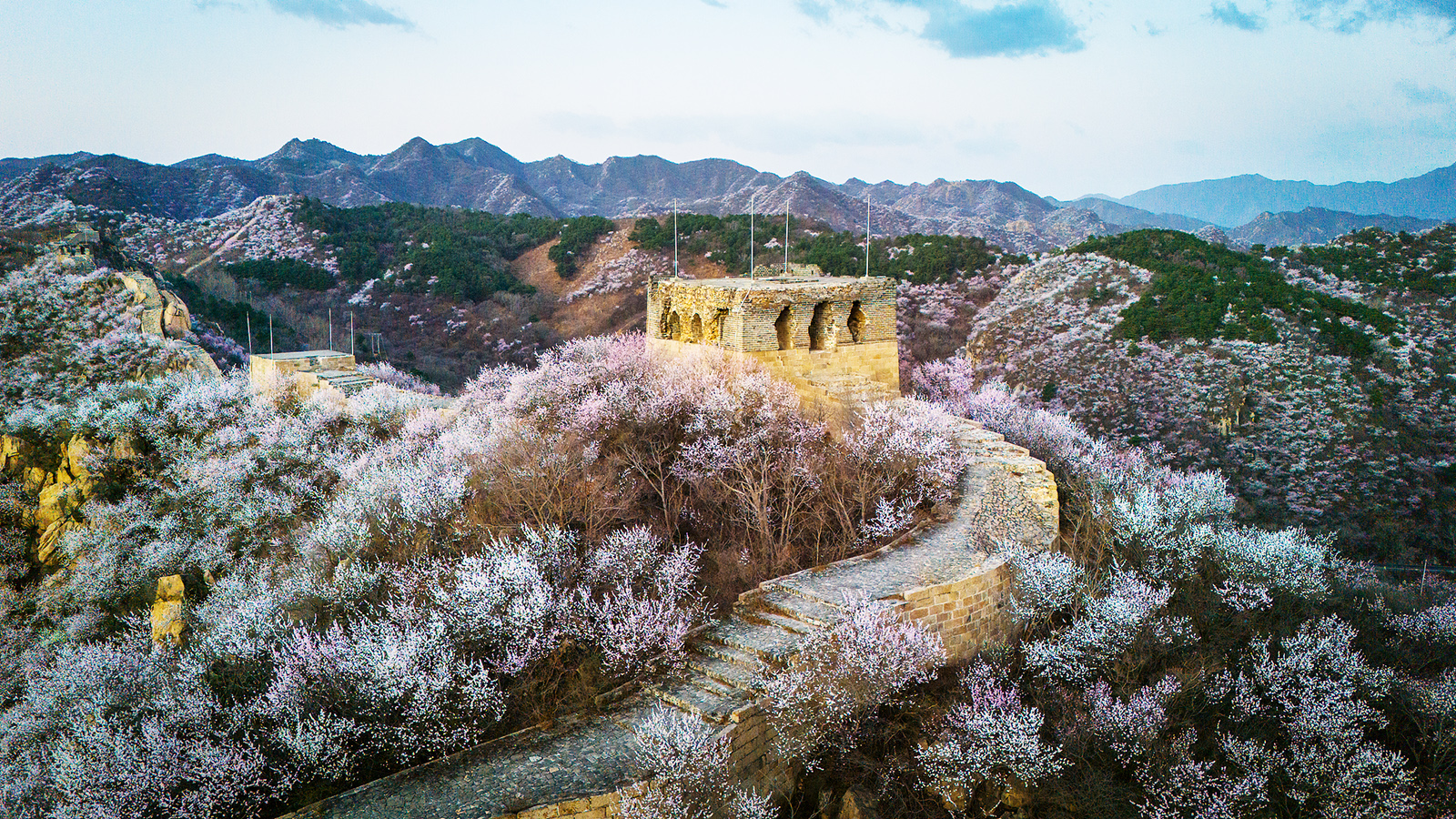 The Longquanyu Great Wall in Beijing is flanked by a sea of blooming flowers. Clusters of apricot and peach blossoms blanket the mountains surrounding this section of the wall, creating a picturesque spring landscape.