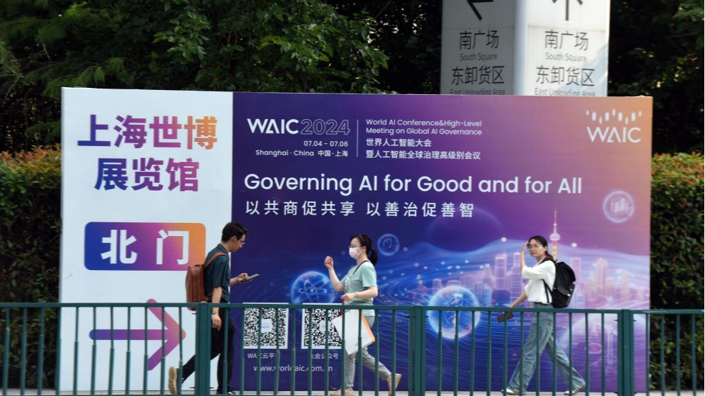 People walk past a billboard for the 2024 World AI Conference and High-Level Meeting on Global AI Governance near Shanghai World Expo Exhibition and Convention Center in east China's Shanghai, July 3, 2024. /Xinhua