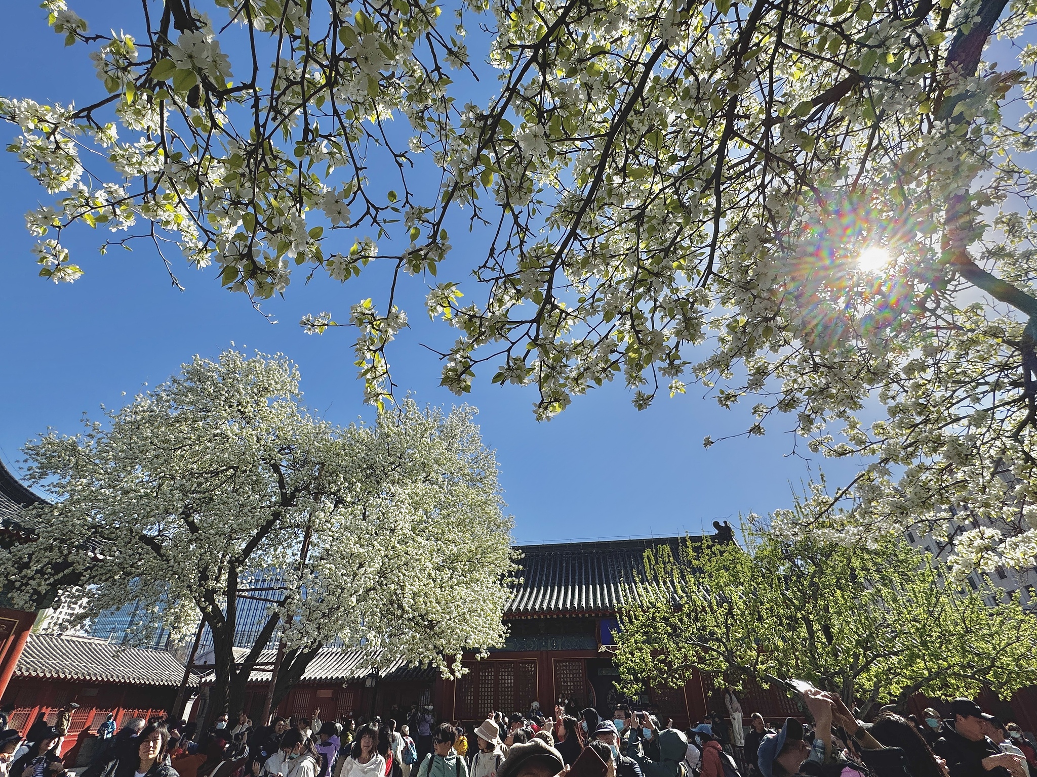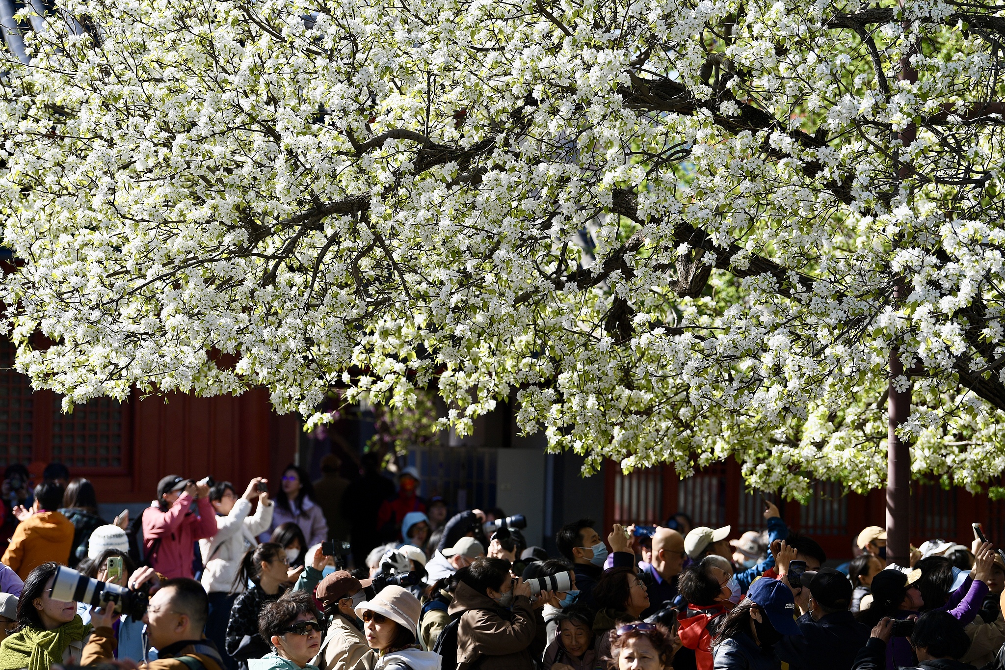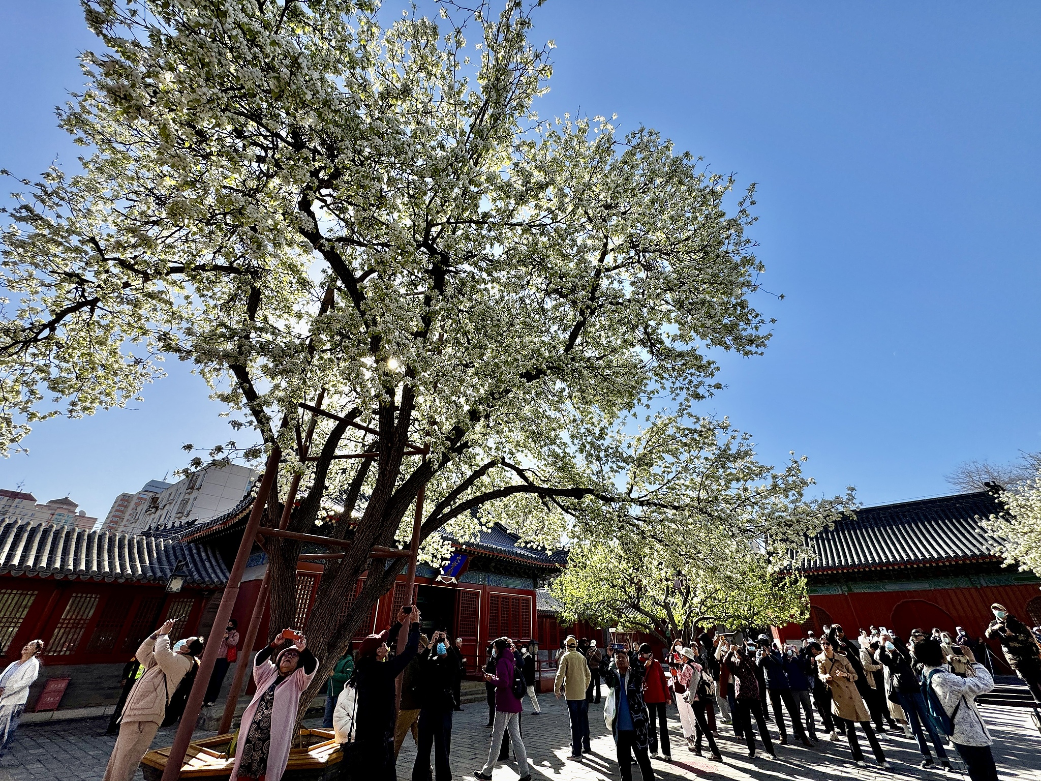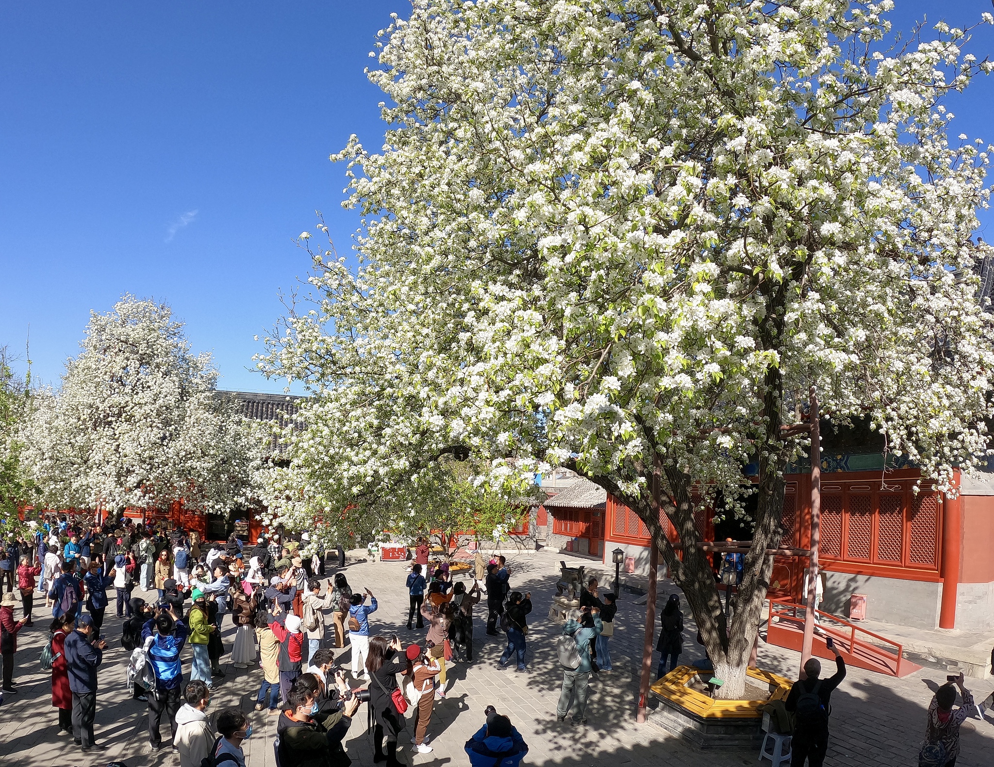 A pair of century-old pear trees recently burst into bloom at the Zhihua Temple in Beijing, drawing crowds of visitors to admire their snow-white blossoms. Towering over 10 meters tall, the pear trees spread their canopies like giant umbrellas to cover much of the courtyard. With its blend of ancient pear trees and unique ancient architecture, the temple has become one of the most popular flower viewing destinations in the capital over the years.