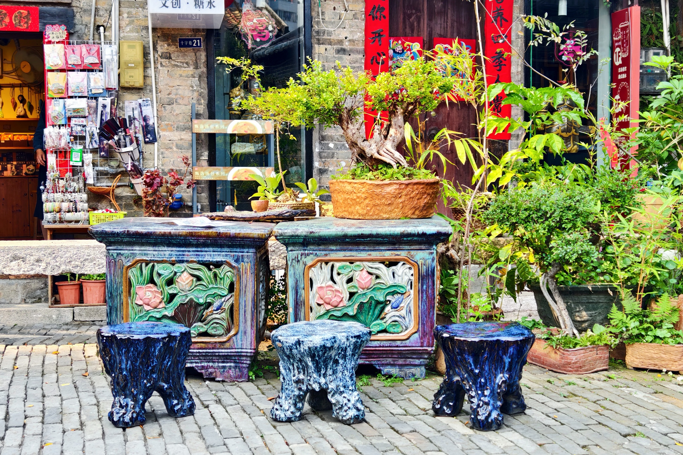 Ceramic chairs and tables are seen near the Nanfeng Ancient Kiln in Shiwan, Foshan, Guangdong Province, March 24, 2025. /CGTN