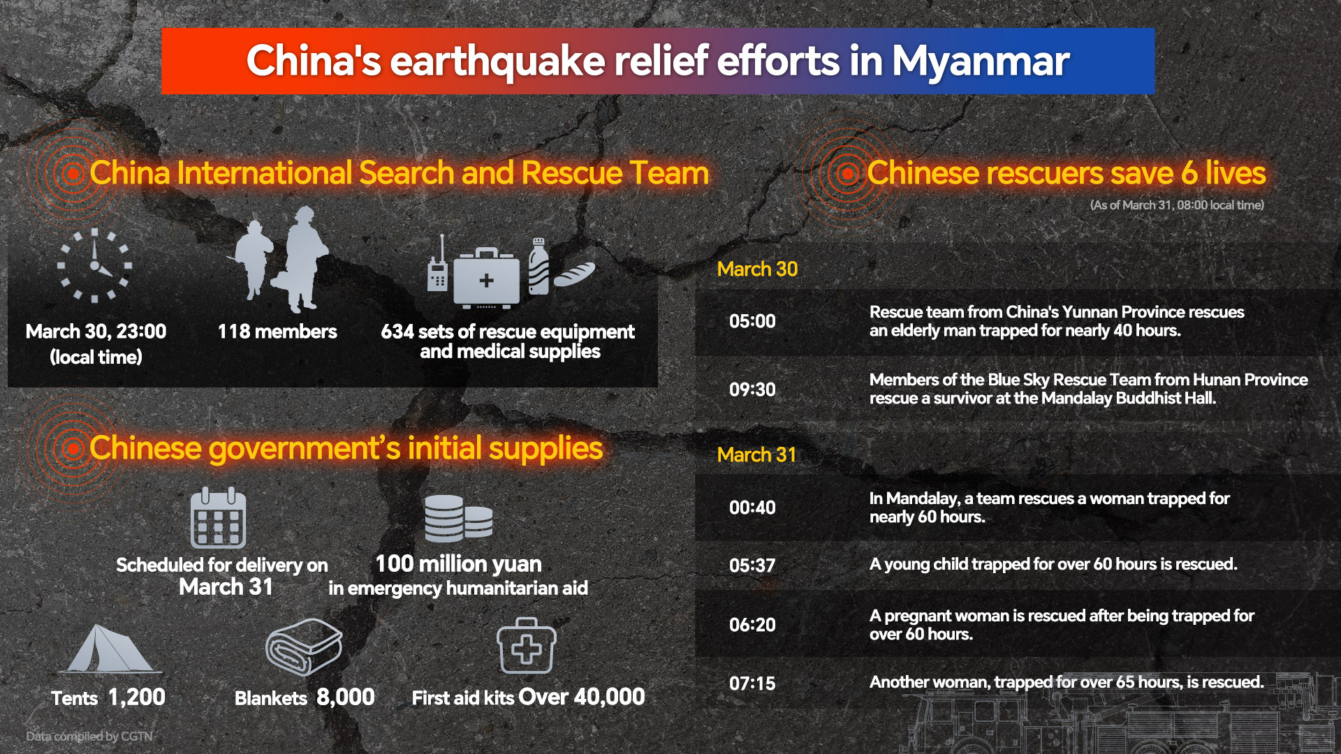 Chinese teams have rescued six survivors in Myanmar as of 8 a.m. on Monday after a devastating magnitude-7.9 earthquake struck the country on Friday, resulting in 2,056 fatalities and around 3,900 injuries. CGTN analyzed the key figures of China's earthquake relief efforts in the following graphic.