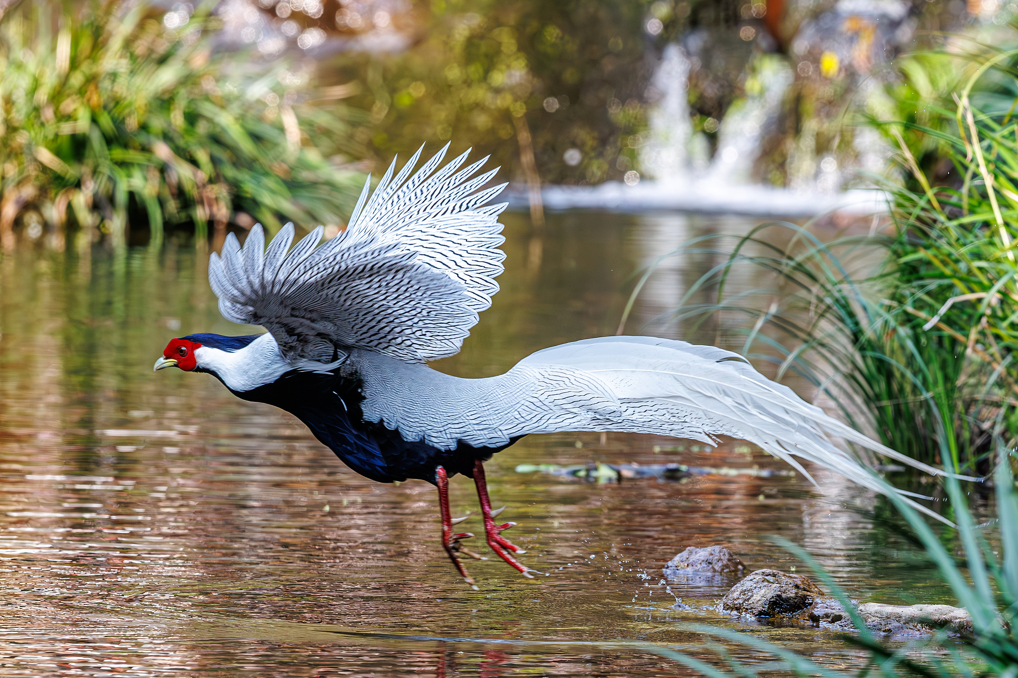 A male silver pheasant forages on a river in Fengtian Village, Sanming City, Fujian Province on March 26, 2025. /VCG
