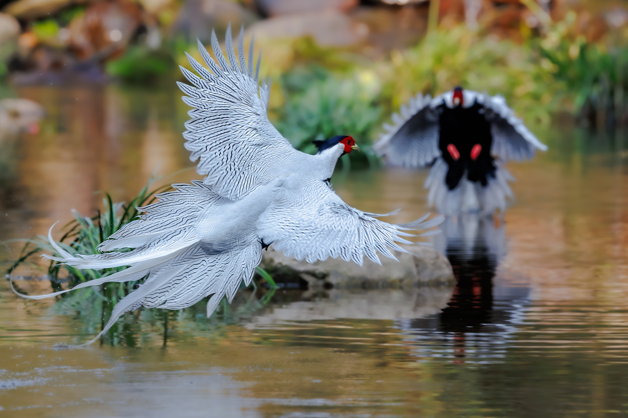 Two male silver pheasants forage on a river in Fengtian Village, Sanming City, Fujian Province on March 26, 2025. /VCG
