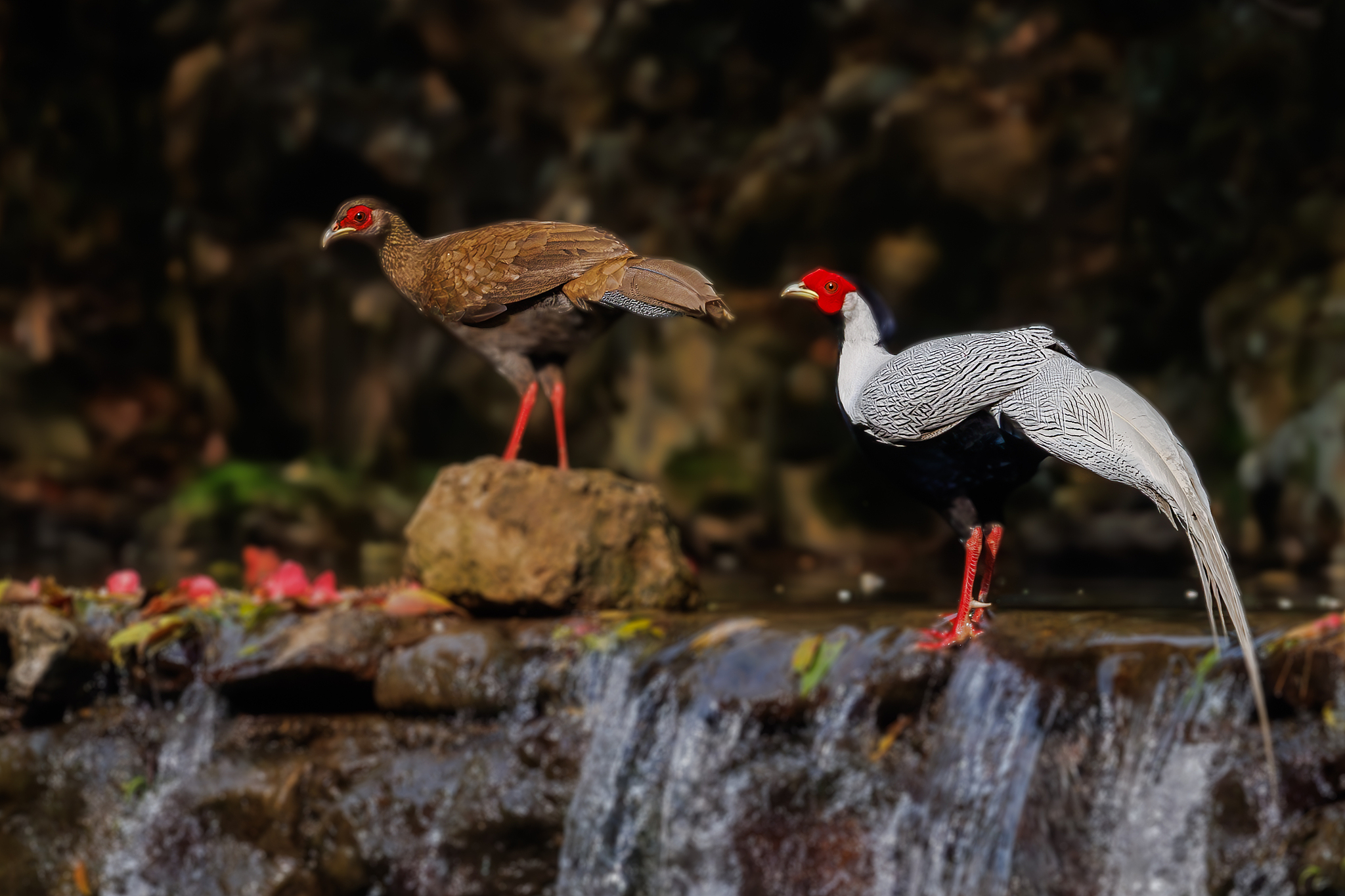 A pair of silver pheasants forage in a river in Fengtian Village, Sanming City, Fujian Province on March 26, 2025. /VCG