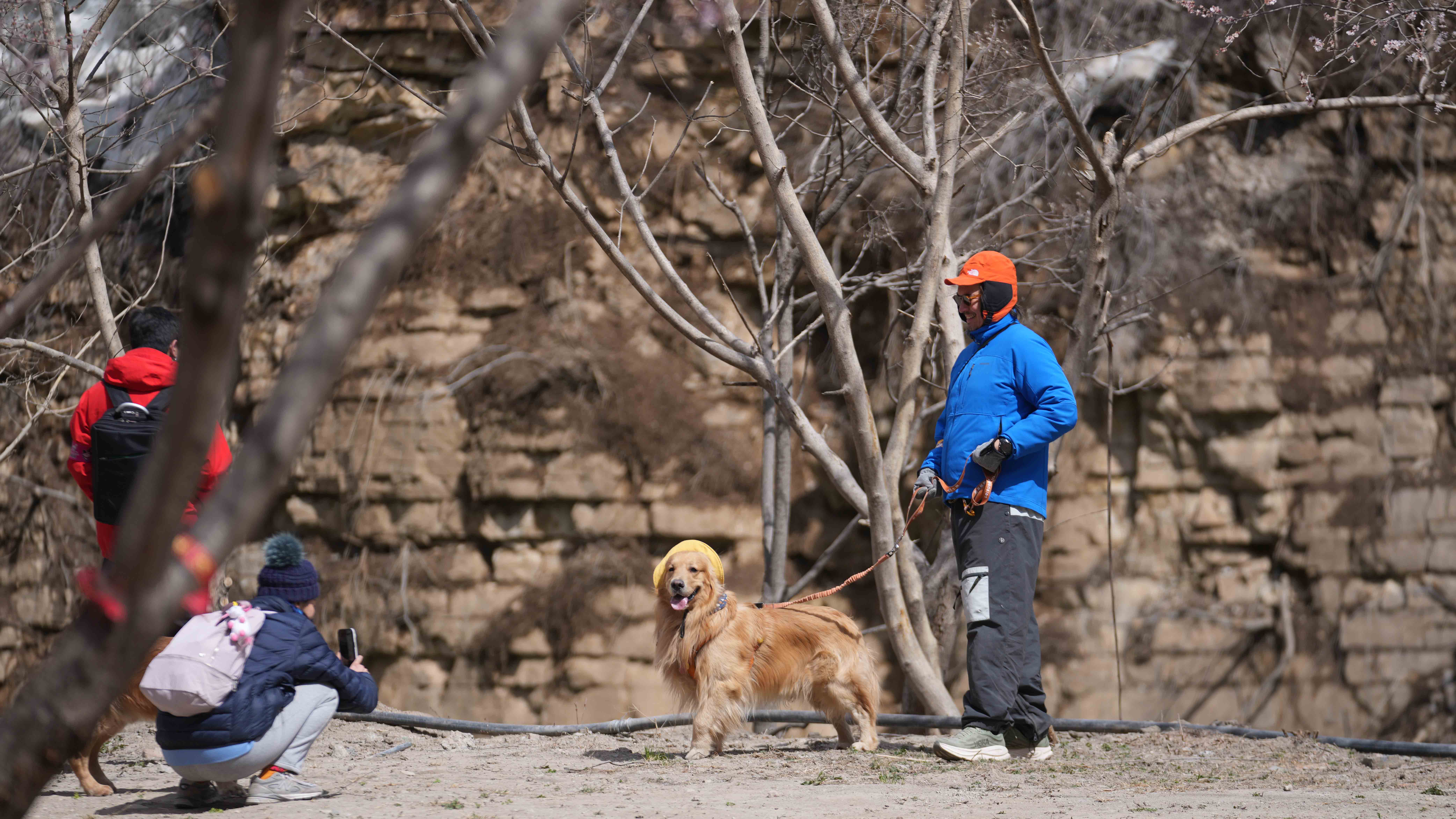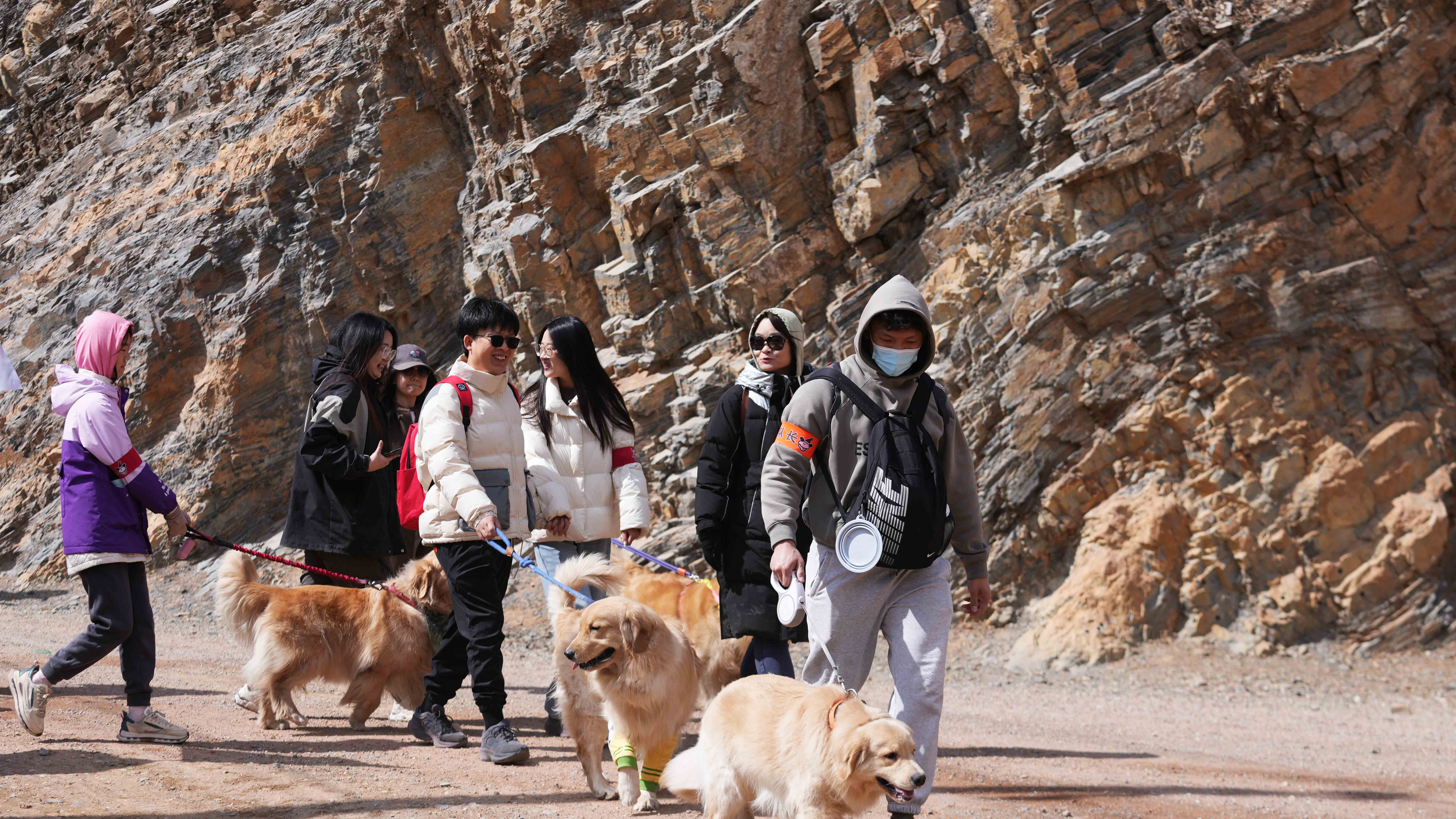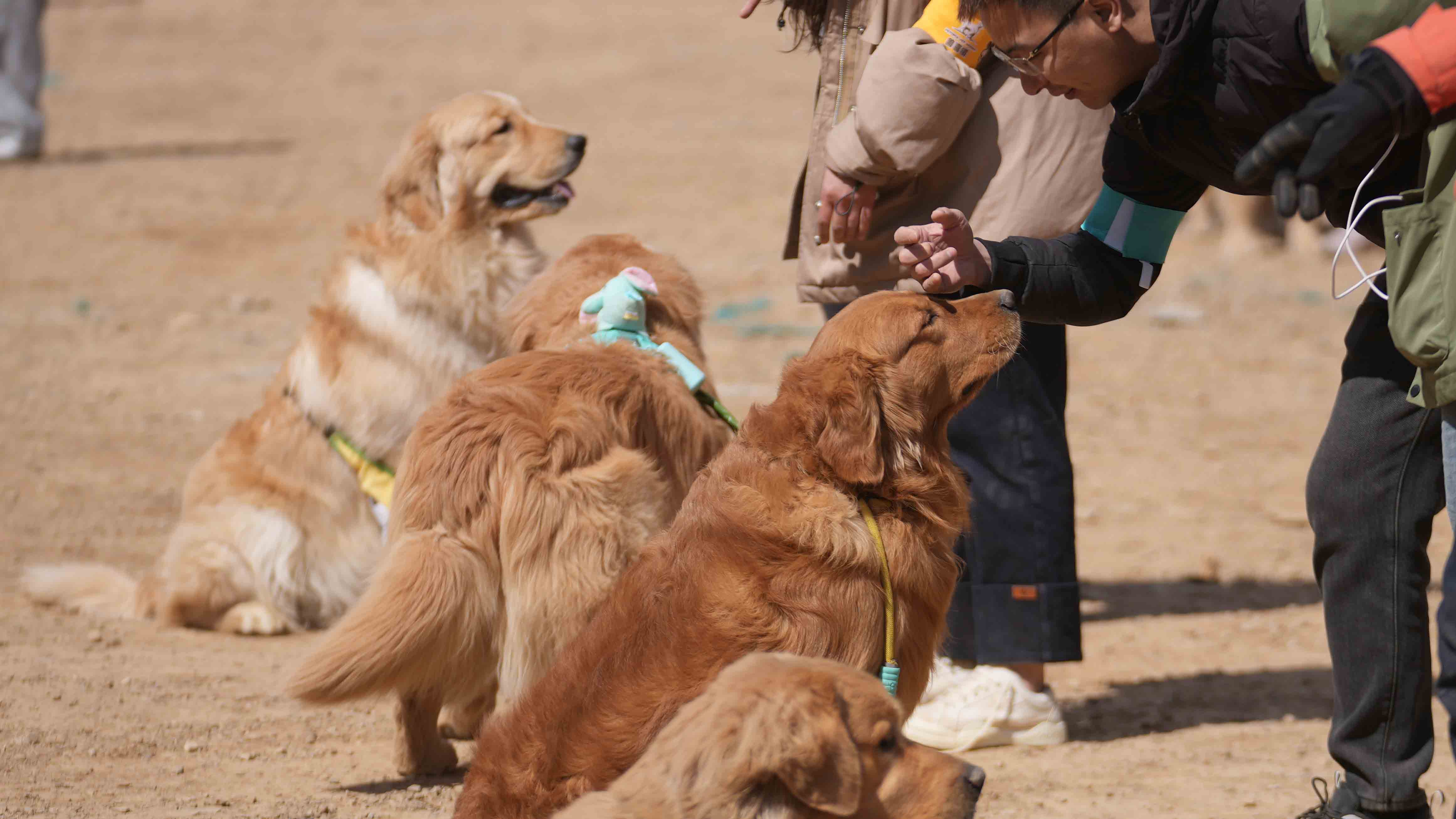 About 60 golden retrievers and their owners went hiking in the mountains of the Tiger Valley Natural Scenic Spot in Beijing's Changping District this weekend. After the hiking team reached the end, the 60 golden retrievers were divided into four teams and had a fun game. The competition included a dog relay race, squats with dogs, and following instructions. Dog owners said they enjoyed the exercise and socializing, and their dogs were excited to be out in nature. The growing pet-themed activities facilitate engagement among pet owners. According to the "China Pet Industry Research Report 2024" released by iResearch, the pet market in China reached 345.3 billion yuan ($48.23 billion) in 2024.