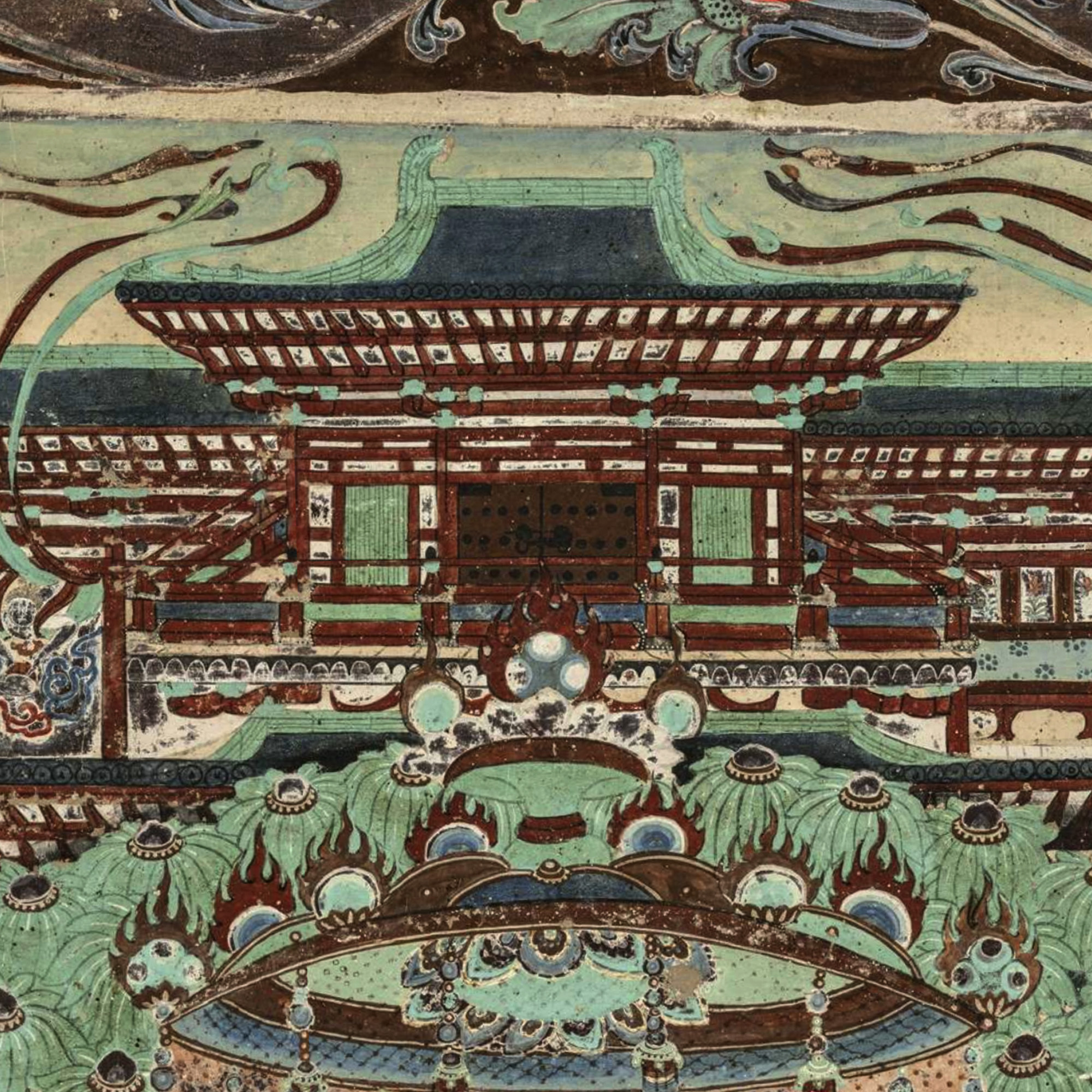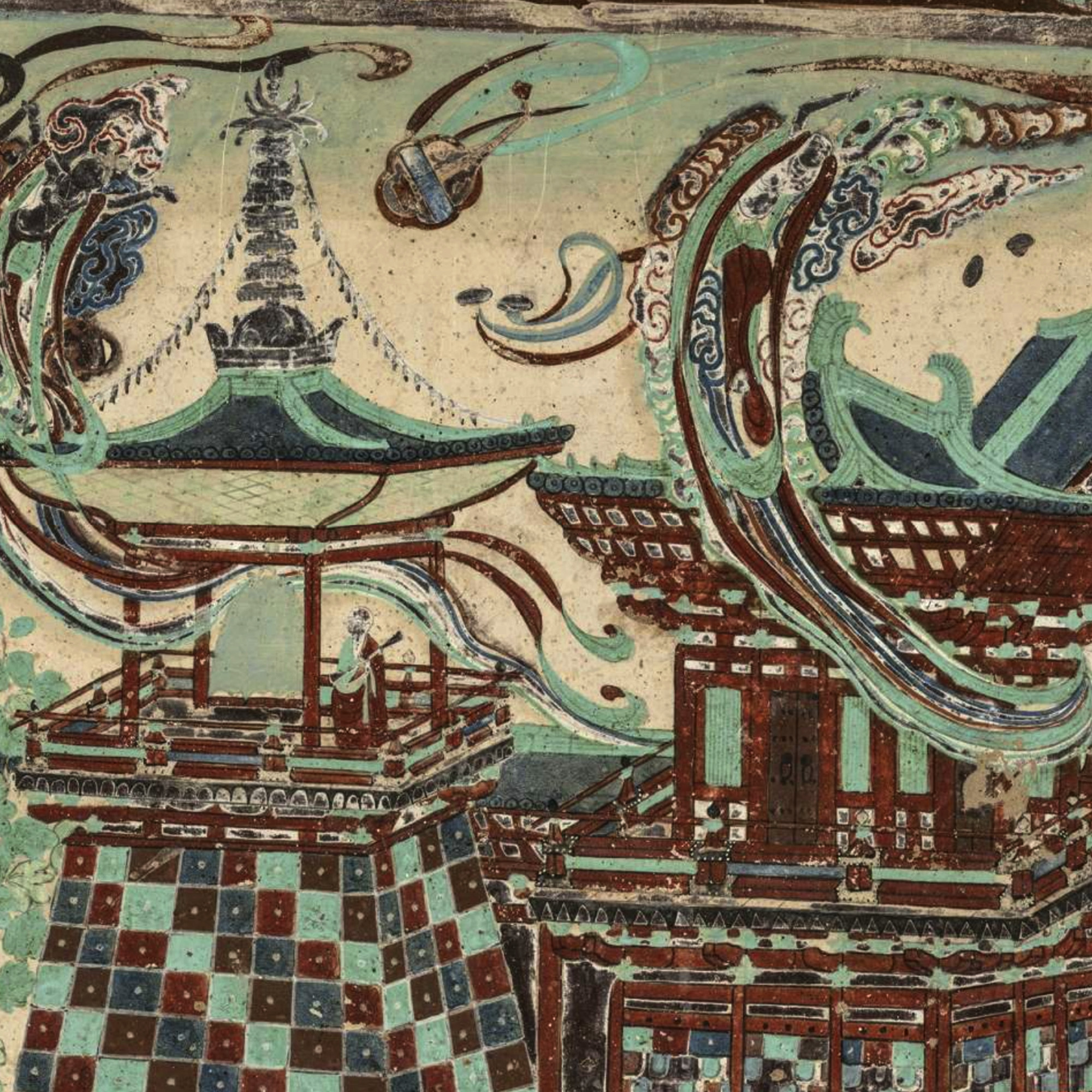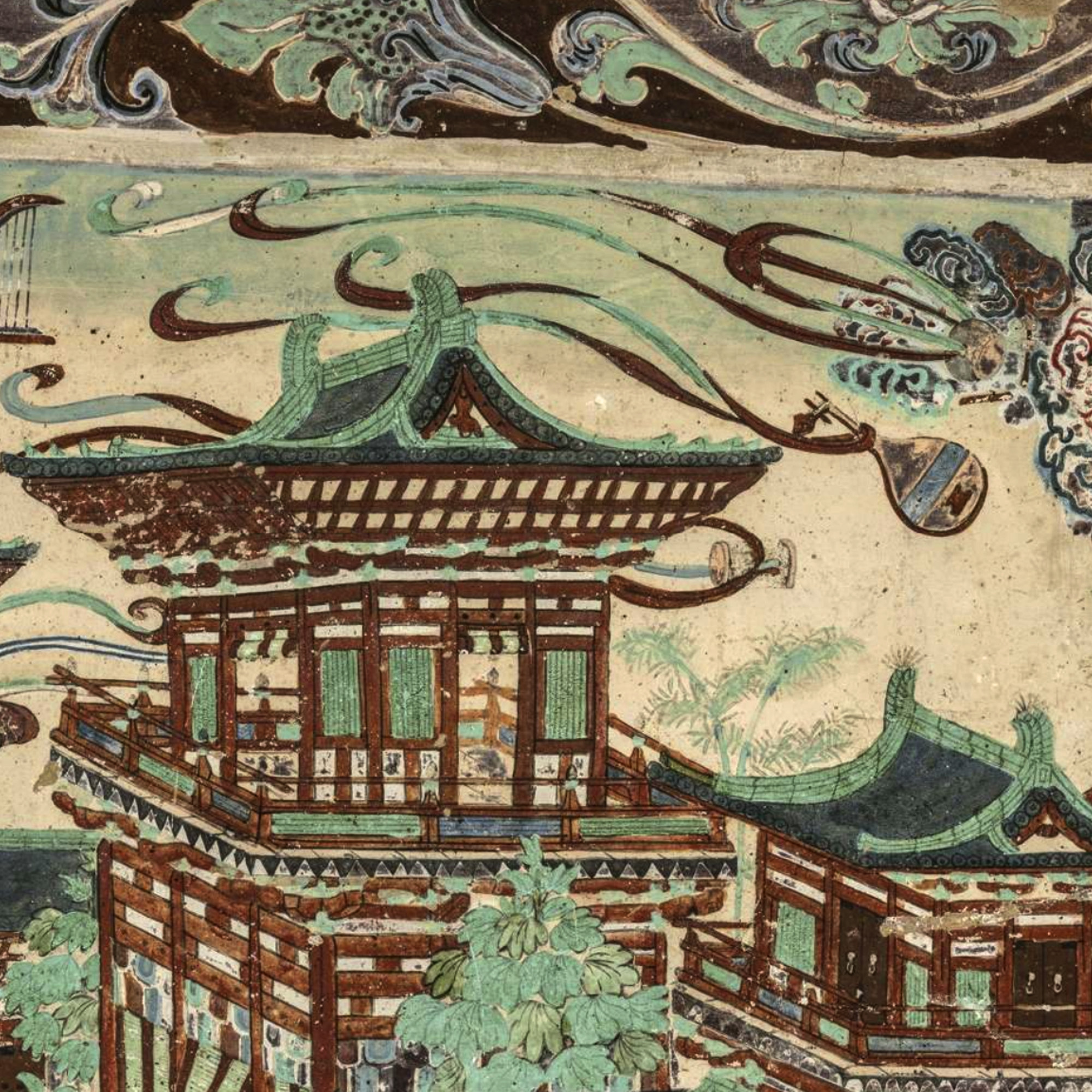 Dunhuang's Mogao Cave 217 holds a masterpiece of Tang Dynasty artistry – where architecture meets the divine. At the heart of the northern wall mural sits Amitabha Buddha in serene meditation, while above him unfolds an imperial-scale architectural wonder – palaces, pavilions and corridors that defy flatness with their depth and grandeur.