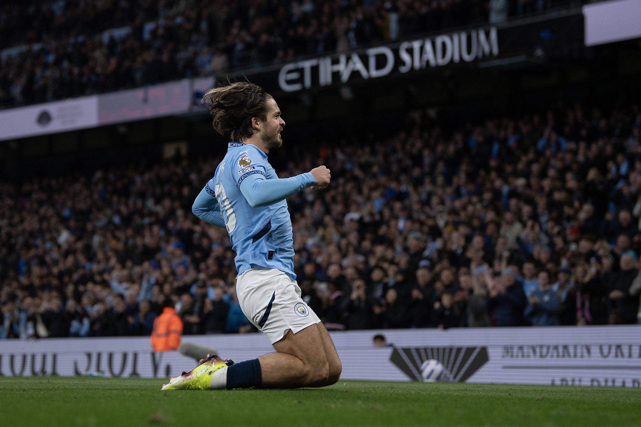 Jack Grealish of Manchester City celebrates scoring his team's first goal during the Premier League match at Etihad Stadium in Manchester, England, April 2, 2025. /VCG