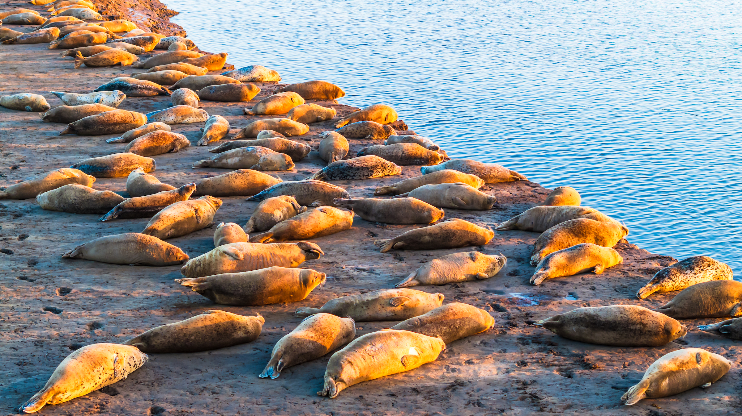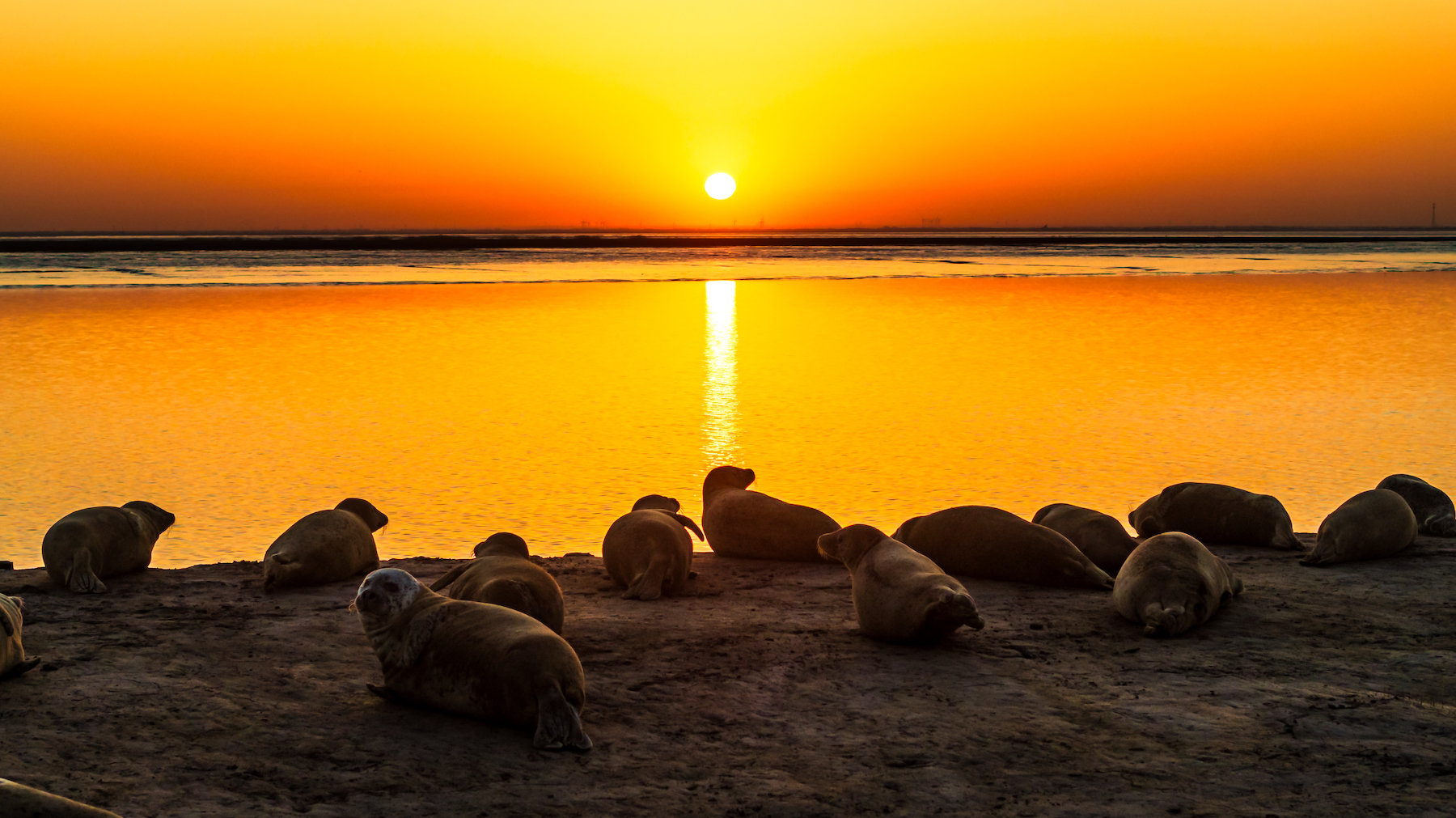 A group of spotted seals bath in the sunset at Liaohekou National Nature Reserve. /Guo Zhiling